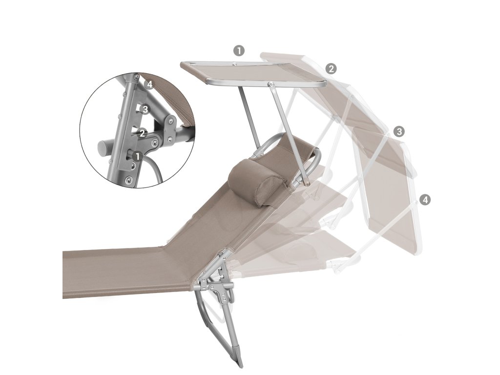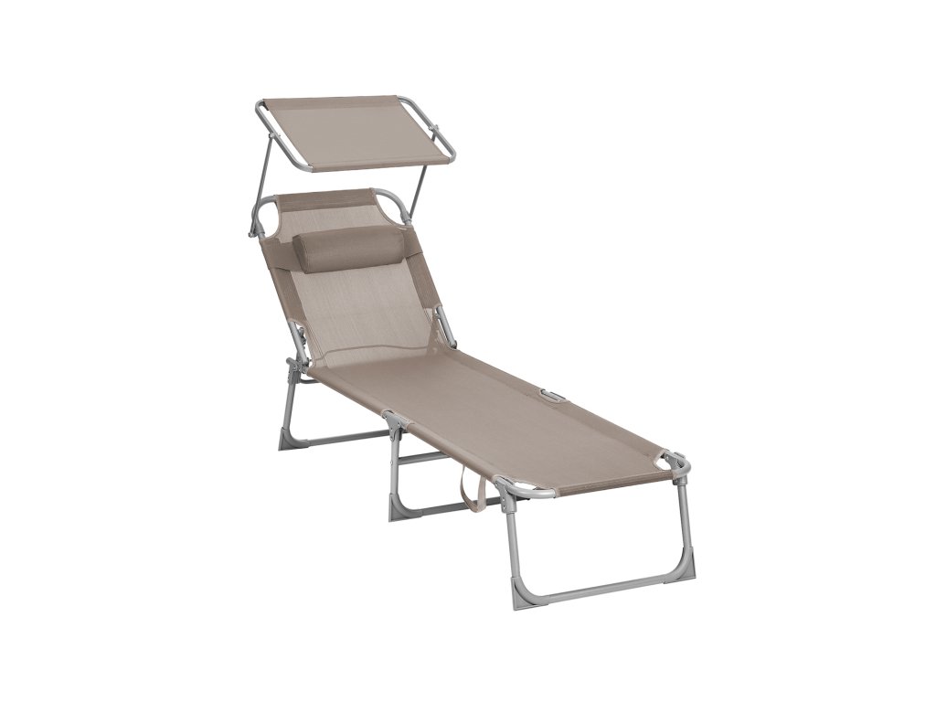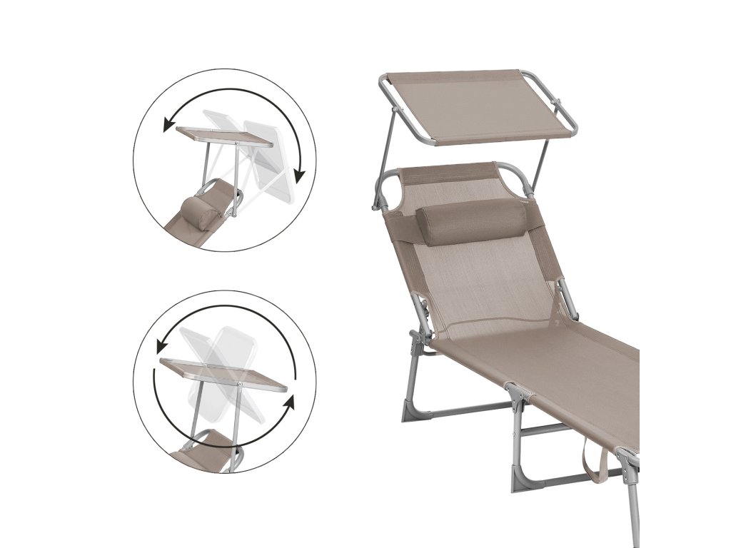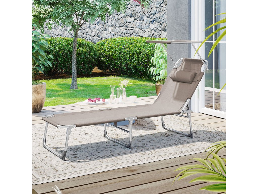 Lehátko, opalovací lehátko, polohovatelné lehátko, s opěrkou hlavy, nastavitelná opěrka zad, slunečník, lehké, skládací, 53 x 193 x 29,5 cm, nosnost 150 kg, na zahradu, hnědé.