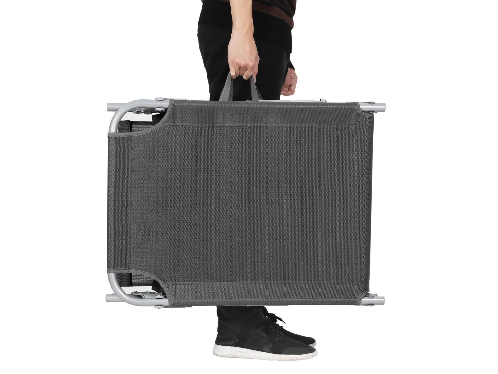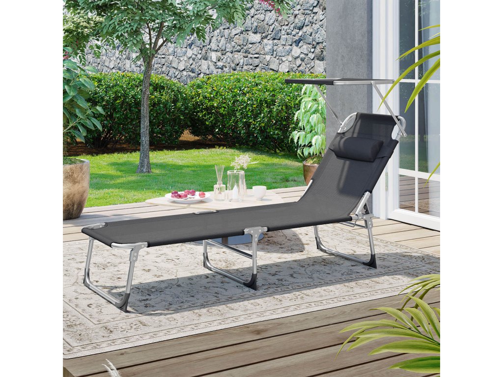 Lehátko, opalovací lehátko, polohovatelné lehátko, s opěrkou hlavy, nastavitelná opěrka zad, slunečník, lehké, skládací, 53 x 193 x 29,5 cm, nosnost 150 kg, na zahradu, tmavě šedá.