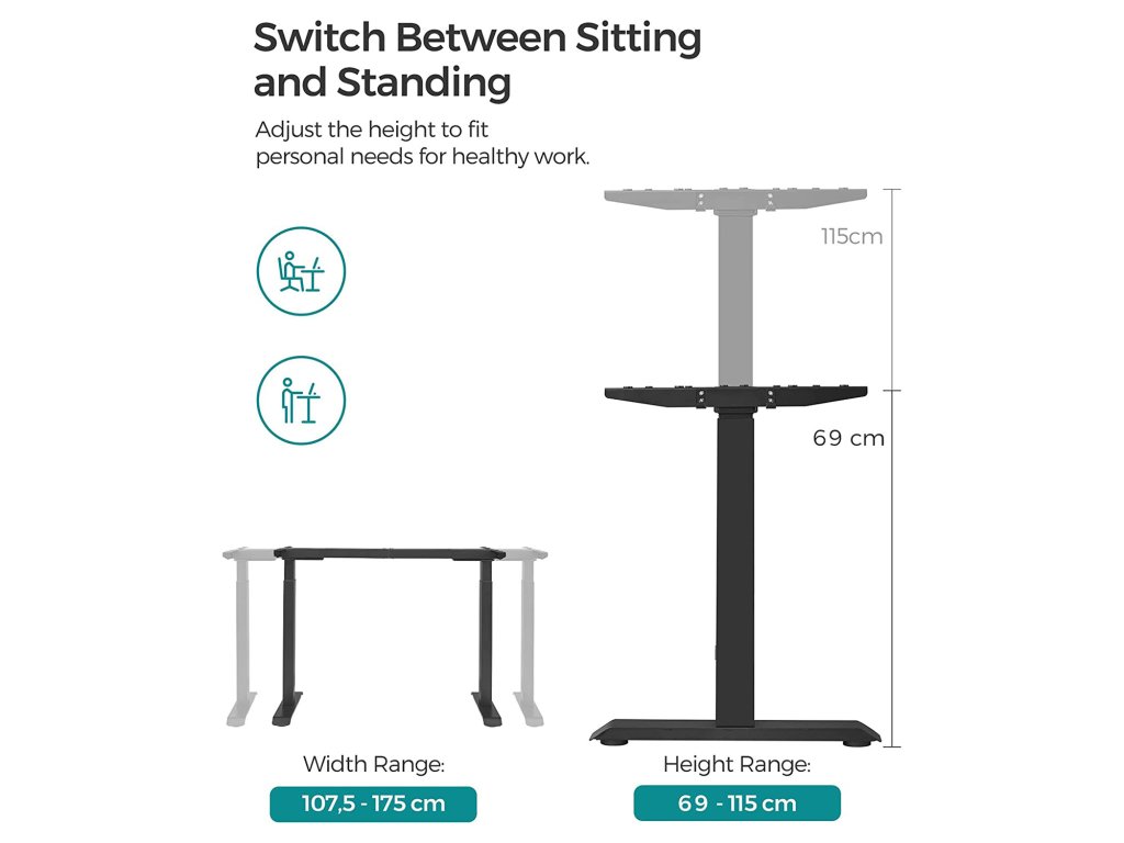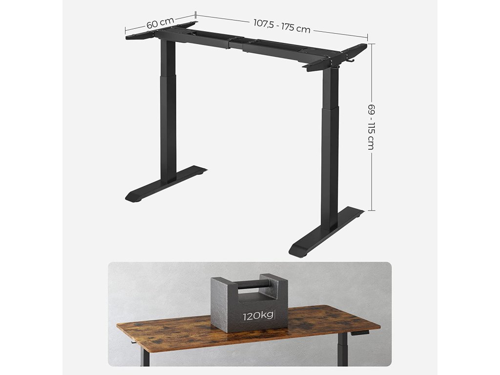 VÝŠKOVĚ NASTAVITELNÝ: Tento rám stolu je nastavitelný v rozmezí 69 až 115 cm, vhodný pro osoby s výškou 1,1 - 1,95 m. vsedě nebo vestoje? Najděte ideální polohu, která uleví vašemu tělu a umožní vám efektivně se učit nebo pracovat.Pevné uchycení: dvojité opěrné tyče, ocelová konstrukce, dvojitý motor a nastavitelné nohy, které lze nahradit 4 kolečky, dodávají tomuto stolnímu stojanu vysokou stabilitu a nosnost 120 kg.Praktický design: pomocí tlačítek si uložíte 4 výšky; z bezpečnostních důvodů se nastavení výšky zastaví a mírně zasune, když stůl při jízdě narazí na překážku.Tichý - Vysoce kvalitní dvojitý motor umožňuje rovnoměrné a tiché nastavení - rychlost nastavení je 25 mm/s, nízká hladina hluku (< 50 dB) rovněž zajišťuje tiché pracoviště.
