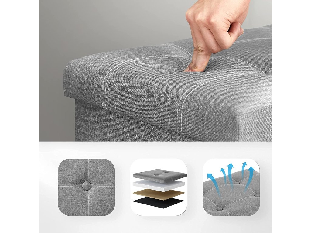 Elegantní a pohodlná: díky jednoduchému vzhledu a decentní barvě se tato lavice dokonale hodí do různých stylů interiéru. Dobře polstrované víko a prodyšný potah z imitace lnu navíc zajišťují vysokou úroveň pohodlí.Posaďte se klidně a uvolněně! Tato stolička je vyrobena z pevných a odolných desek MDF a unese až 300 kg. Zvednete uvolněně nohy? Sundat si boty? Prostě jděte!