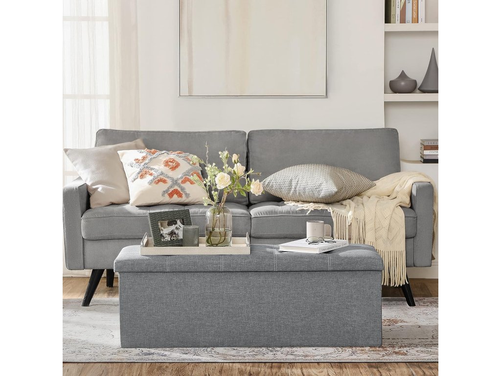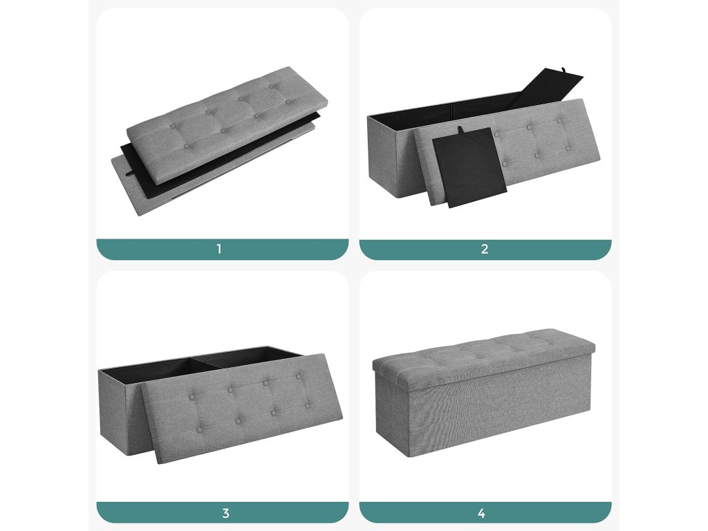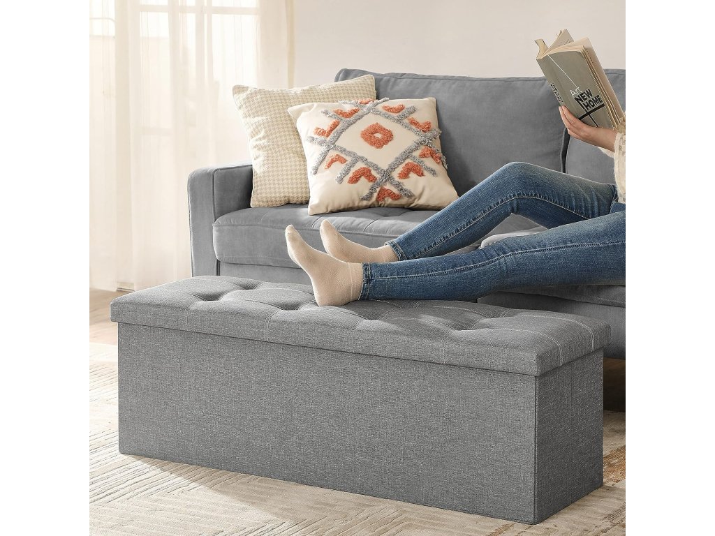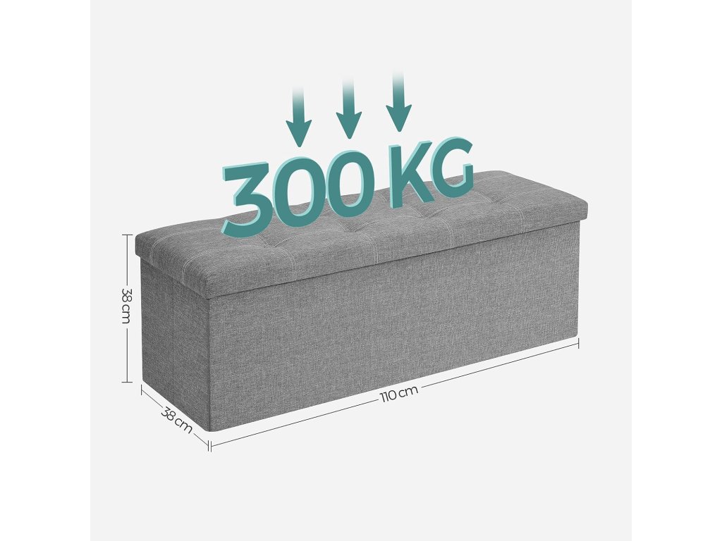Tolik úložného prostoru! Tato komoda o rozměrech 110 x 38 x 38 cm nabízí spoustu úložného prostoru pro uložení vašich věcí, jako jsou knihy, plyšové hračky a oblečení. Konečně můžete vše přehledně uložit Elegantní a pohodlná: díky jednoduchému vzhledu a decentní barvě se tato lavice skvěle hodí do různých stylů interiéru. Dobře polstrované víko a prodyšný potah z imitace lnu navíc zajišťují vysokou úroveň pohodlí. Posaďte se klidně a uvolněně! Tato stolička je vyrobena z pevných a odolných desek MDF a unese až 300 kg. Zvednout uvolněně nohy? Sundat si boty? Prostě jděte! Když se nepoužívá.. tuto truhlu můžete jednoduše složit a uložit do rohu - šetří místo! Co dostanete? Pohodlný doplněk k vaší pohovce? Lavičku do předsíně nebo na konec postele? Úložný prostor v obývacím pokoji? Žádný problém. Tento produkt je skutečně všestranný.