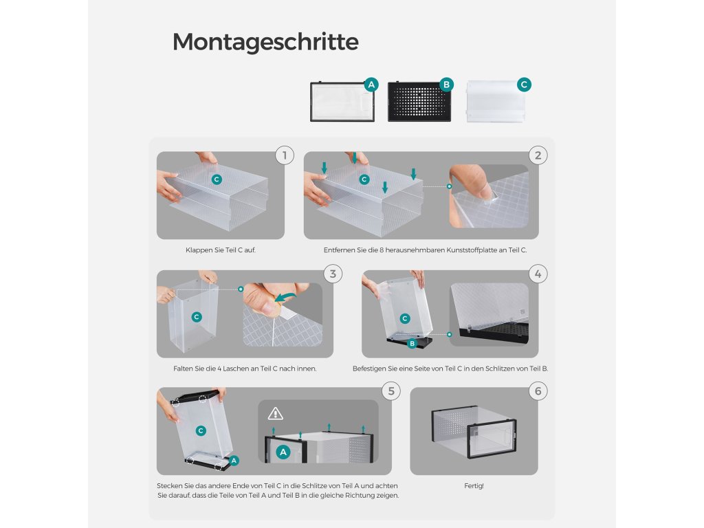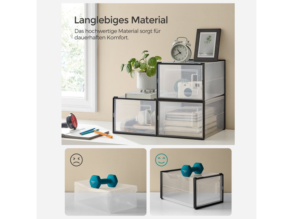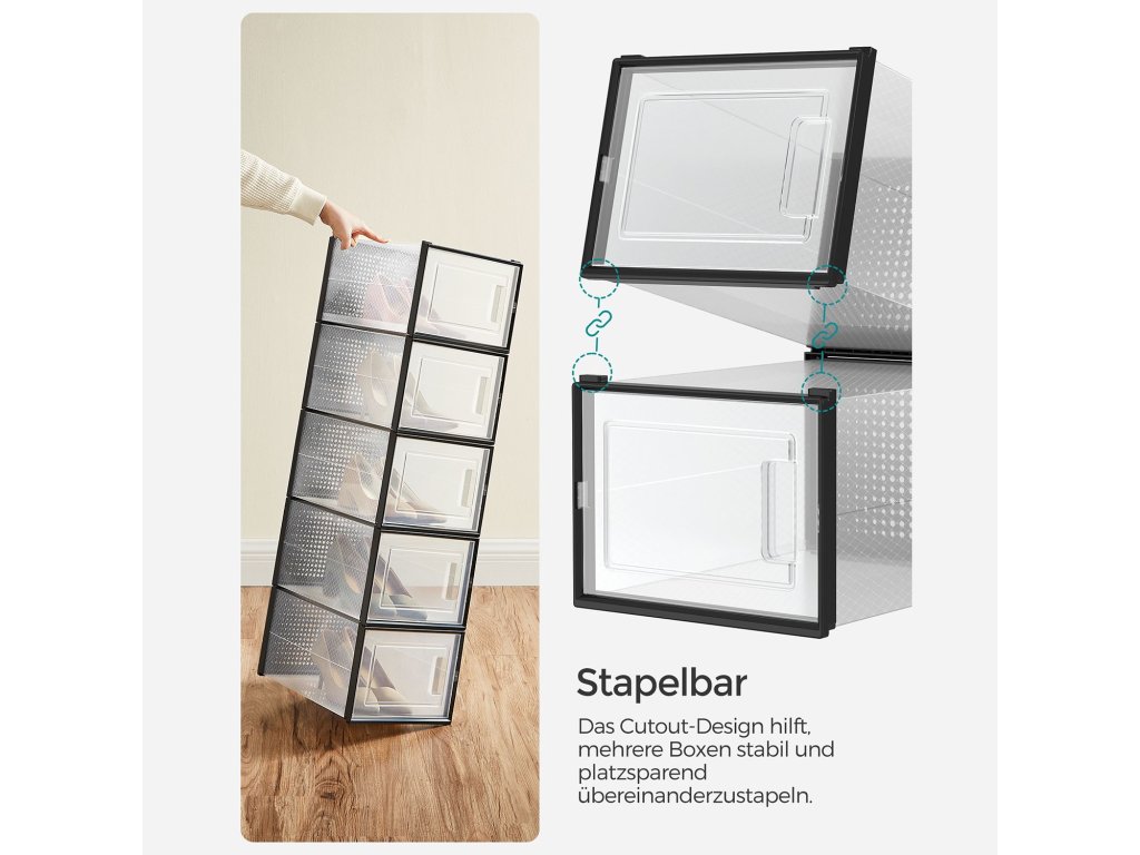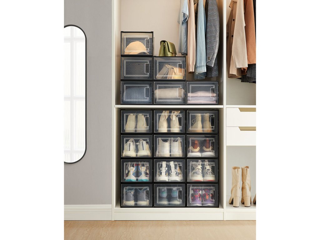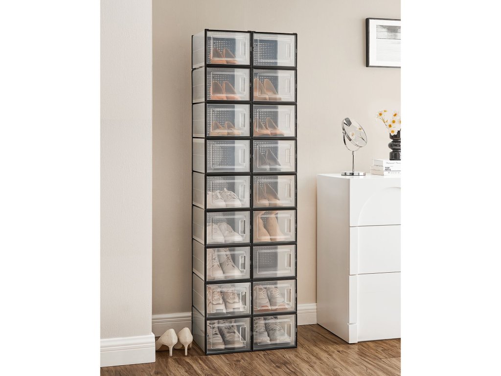 Mějte přehled Už se nemusíte neustále přehrabovat v jednotlivých krabicích od bot, abyste našli požadovaný pár. Díky těmto průhledným úložným boxům s víkem najdete každý pár bot na první pohled!.Připraveno během chvilky: stačí složit jednotlivé díly a stohovací boxy s vnitřními rozměry 31 x 24,5 x 17,5 cm, vhodné až do velikosti 46; tenisky, podpatky a lodičky mají konečně své místo;Na sebe nebo vedle sebe Drážka na dně usnadňuje uspořádání stohovatelných krabic na boty - můžete je poskládat do věže nebo je umístit vedle sebe; Kromě toho jsou boty dobře odvětrané díky větracím otvorům;Balení obsahuje 18 průhledných plastových boxů s předními dvířky, stohovatelných a skládacích s větracími otvory, s těmito boxy, které se snadno skládají a nezabírají místo, když se nepoužívají. se můžete brzy rozloučit s hromadami bot.| Kategorie: | Botníky |
