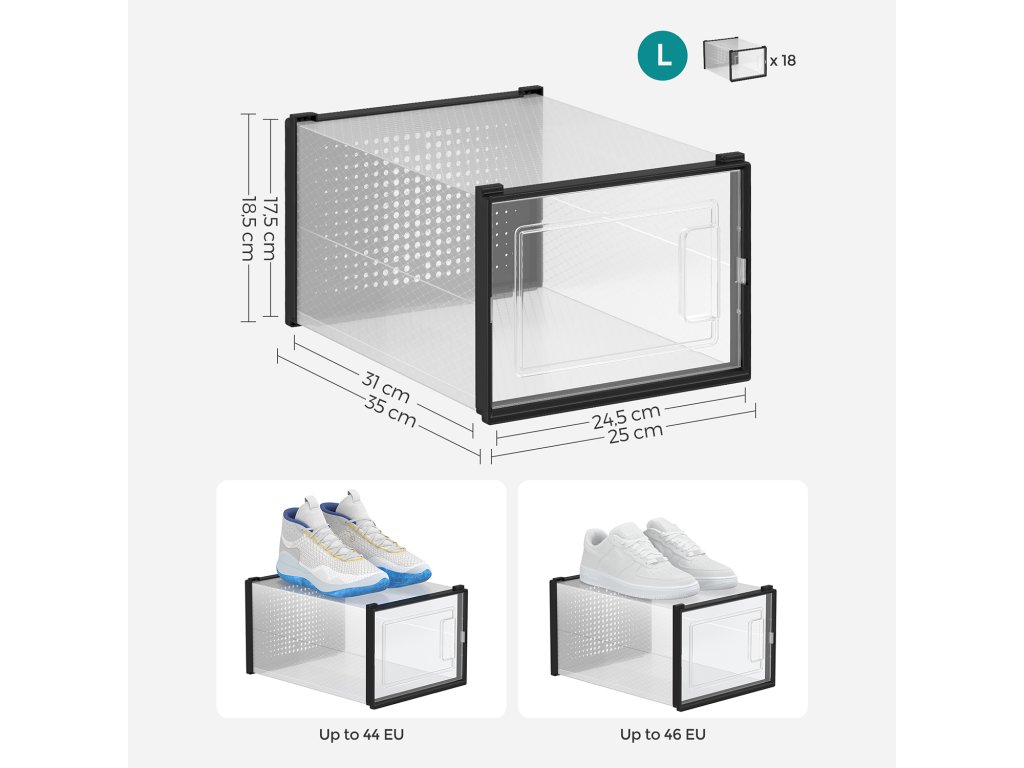 Krabice na boty, balení 18 skládacích a stohovatelných krabic až do velikosti 46, transparentní černá barva.