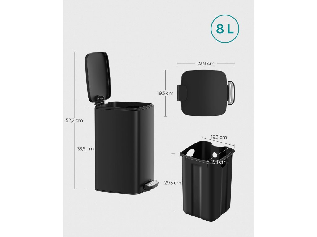 ÚSPORA MÍSTA Kompaktní profil o rozměrech 24 x 19,3 x 33,5 cm (D x Š x V). tato 8litrová koupelnová odpadková nádoba se dokonale hodí do malých prostor a poskytuje velkou kapacitu, přičemž zabírá minimální prostor na podlaze.Nepropustný a bez zápachu Kompaktní odpadkový koš je vyroben z nerezavějící oceli se vzduchotěsným víkem, které zabraňuje odkapávání vody na podlahu, zajišťuje, že obsah zůstane suchý, a izoluje nepříjemné pachy. Ideální pro mokré koupelny.Soft Close & Constant Opening Tento pedálový koš je vybaven víkem, které se zavírá tiše a plynule. Víko můžete také podržet otevřené, abyste mohli v případě potřeby snadno vyhodit odpad.Vyjímatelný kbelík s pohodlnou rukojetí Pro snadné vyprázdnění nebo vyčištění stačí zvednout vnitřní kbelík pomocí rukojetí. Zadní rukojeť umožňuje snadný pohybOtevírání bez použití rukou Víko koše lze otevřít pomocí pedálu, abyste se rychle zbavili odpadu, aniž byste se museli koše dotýkat rukama.| Kategorie: | Odpadkové koše |