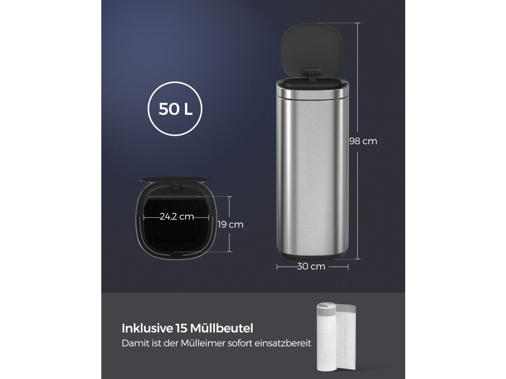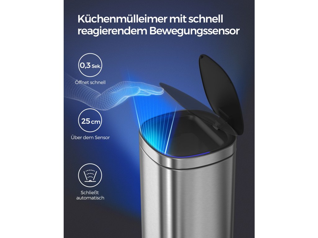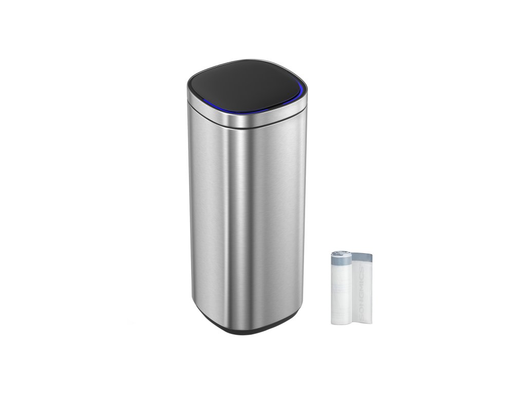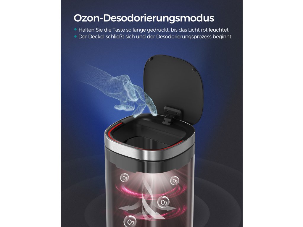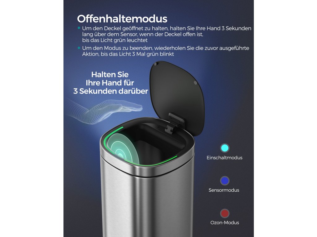 Kuchyňský odpadkový koš o objemu 50 litrů s automatickým senzorem pohybu a vícebarevnou kontrolkou Eliminace zápachu s ozonovým víkem s funkcí Hold Open.