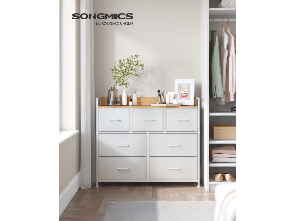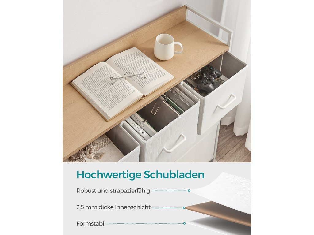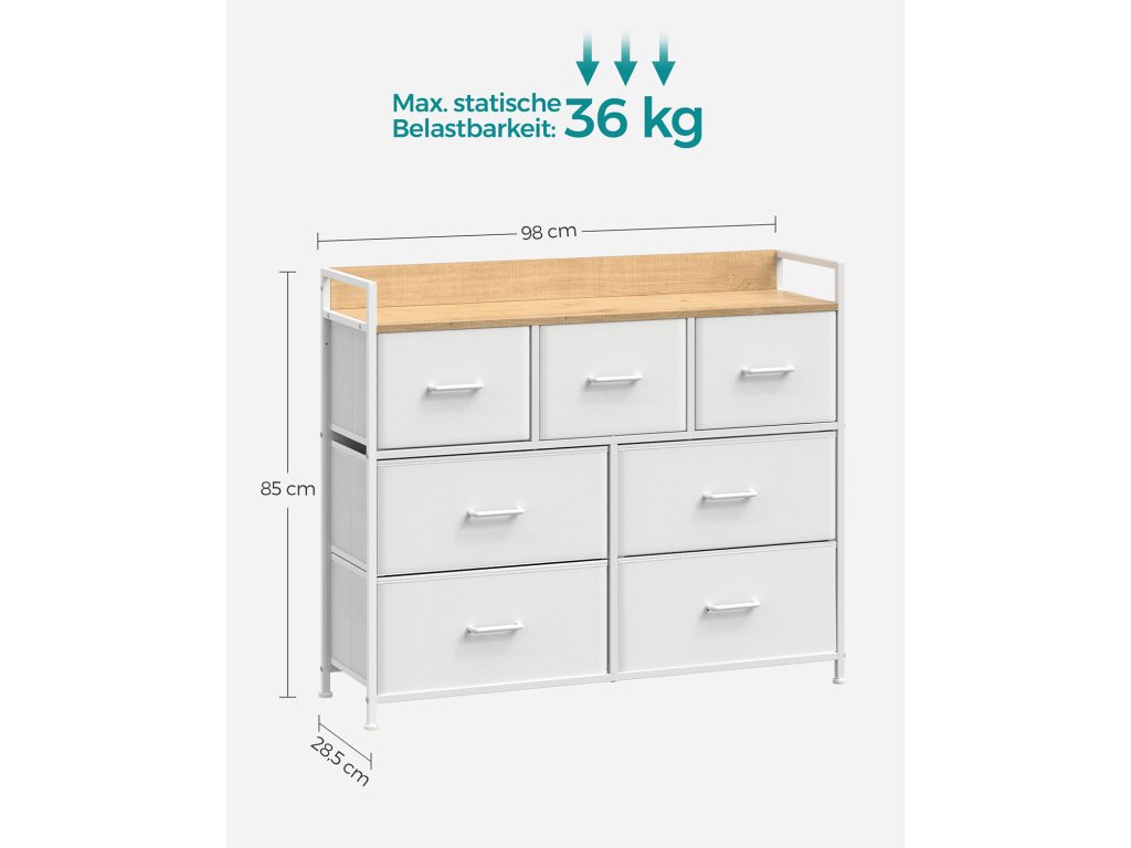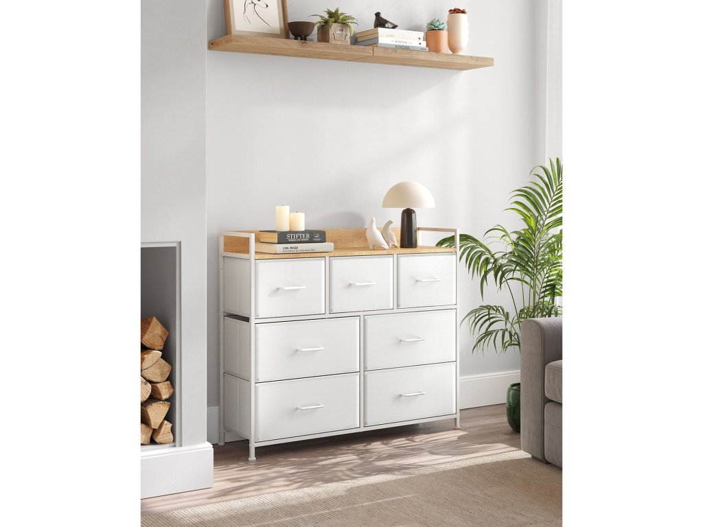 Komoda, skříň, úložný prostor, 7 zásuvek v látce s úchytkami, kovový rám, moderní styl, bílá barva a dřevo.