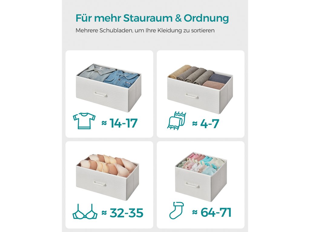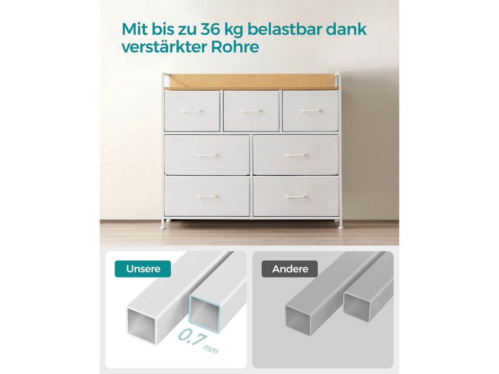 Pro ukládání a třídění Díky 7 zásuvkám (4 velkým a 3 malým) můžete ukládat věci podle kategorií. Do každé velké zásuvky se vejde 60-70 ponožek, 13-16 triček nebo 7-11 kalhot, do každé malé zásuvky 40-45 ponožek, 9-10 triček nebo 4-7 kalhot. [Stabilní a bezpečná] Tato komoda je vybavena nastavitelnými nožičkami, které zajišťují stabilitu i na nerovném povrchu. Dodávaná sada proti překlopení zajišťuje dodatečnou stabilitu a bezpečnost. [Všestranný] Použijte jej v ložnici nebo šatně k uložení oblečení, v obývacím pokoji na rostliny a dekorace nebo jej použijte jako stojan na televizi. [Snadná montáž] Díky očíslovaným dílům a ilustrovaným návodům je montáž této skříňky se 7 zásuvkami hračkou. [Boční tyče a zvýšené okraje vzadu] Tyče na bocích a zvýšené okraje vzadu zabraňují pádu vašich věcí. Tyče lze také použít jako úchyty pro změnu místa.| Kategorie: | Komody |