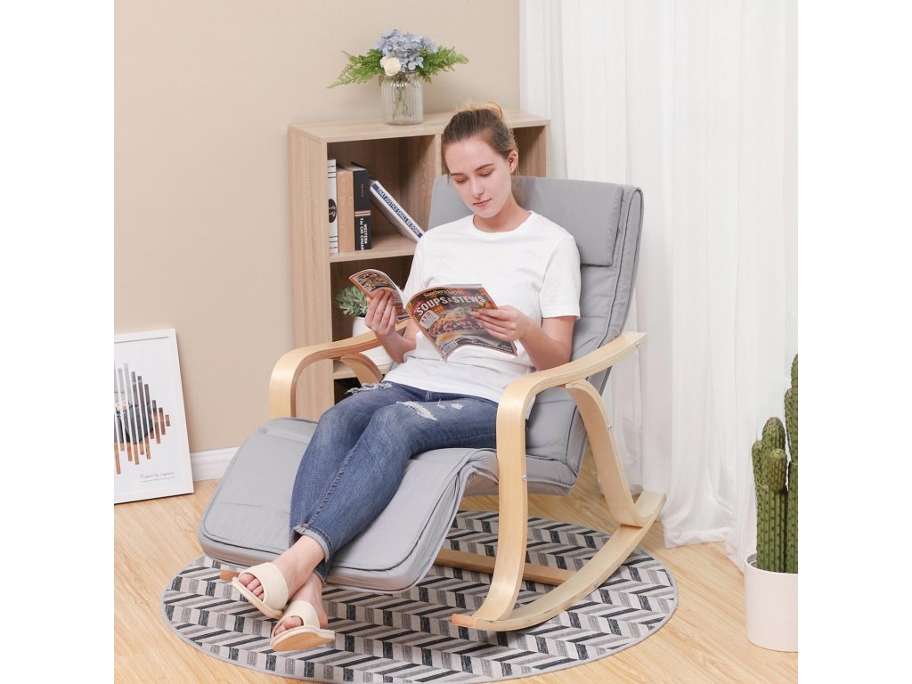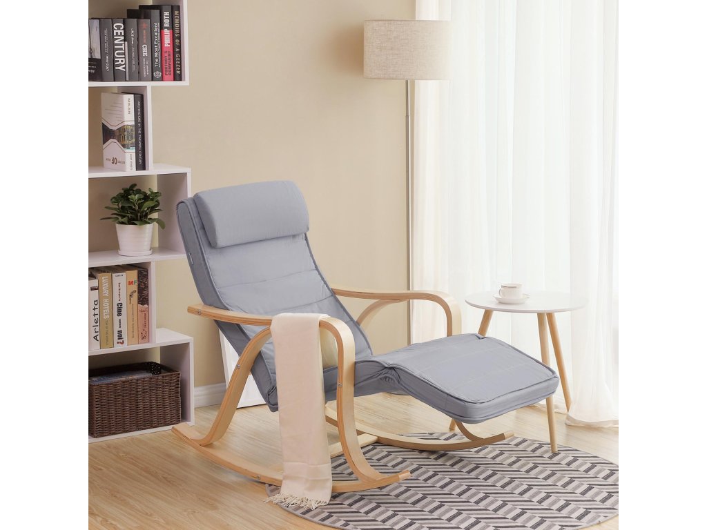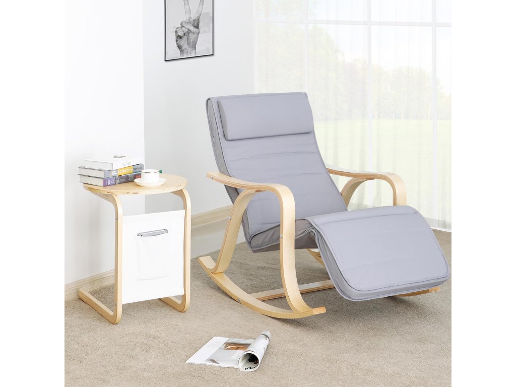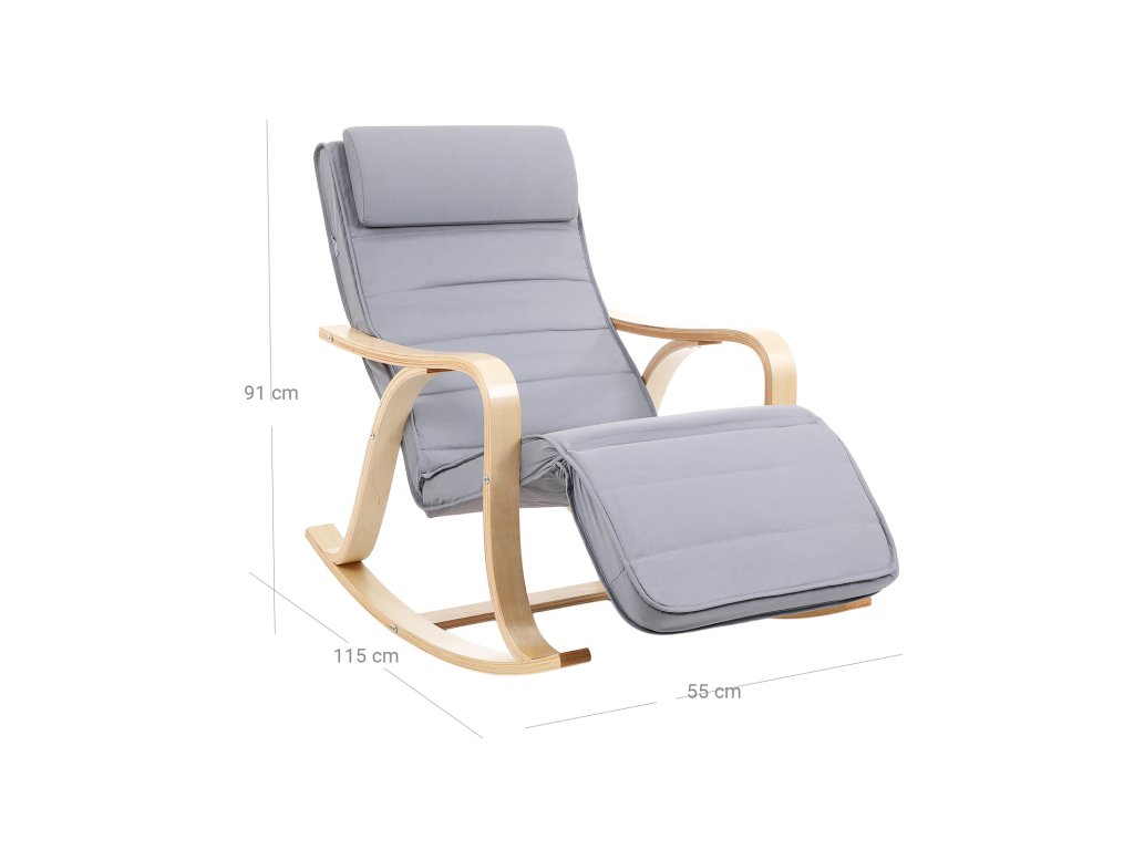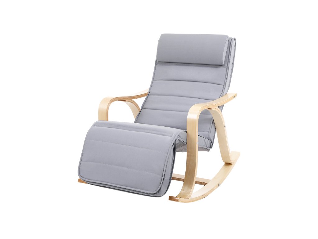 Houpací polohovací křeslo s 5-cestným nastavením opěrky lýtek, zatížení 150 kg, šedá, dřevo, 67 x 125 x 91 cm.