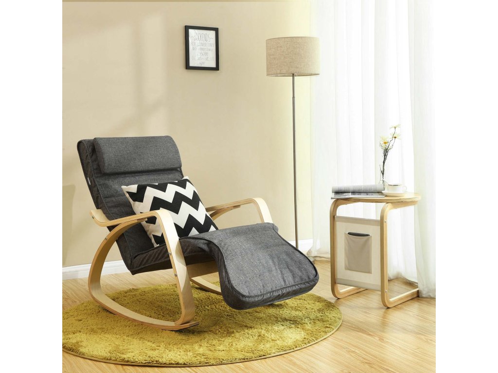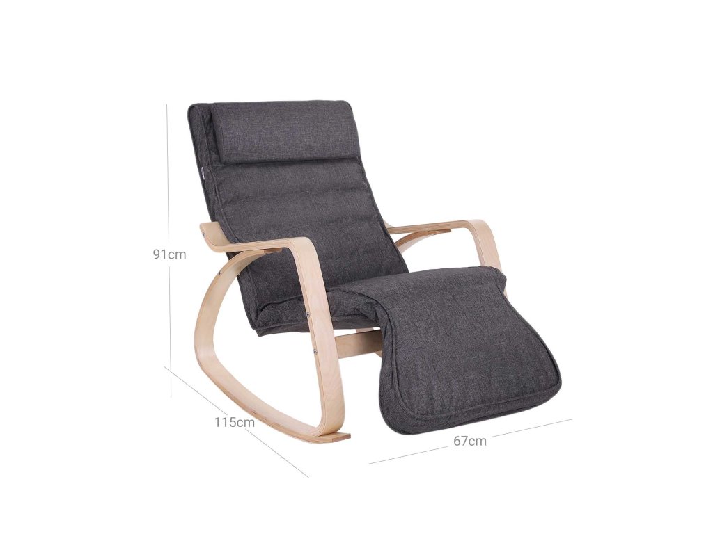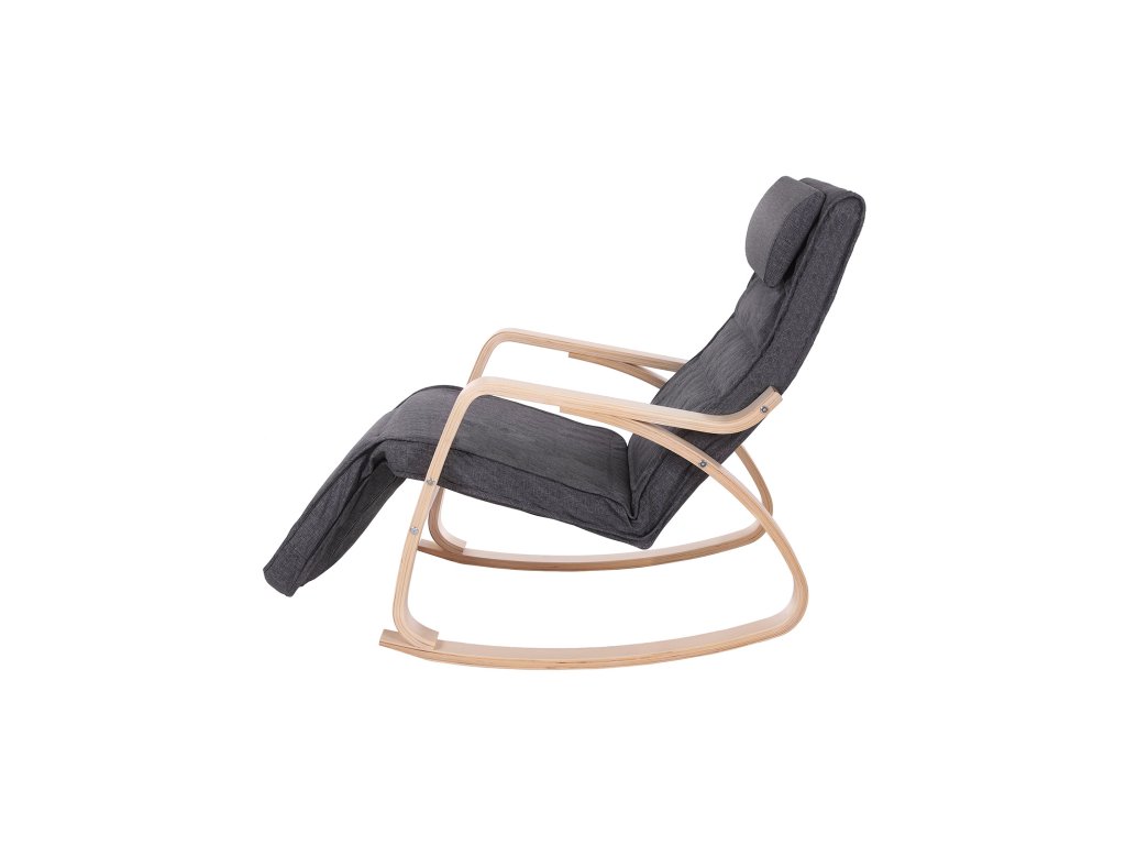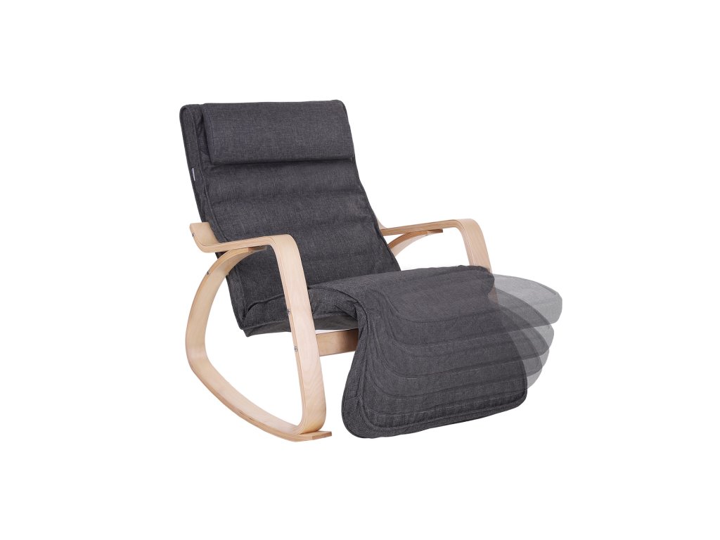 Houpací křeslo s 5směrně nastavitelnou opěrkou nohou, lehátko, maximální nosnost 150 kg, rám z březového dřeva, umělé prádlo, tmavě šedá barva.