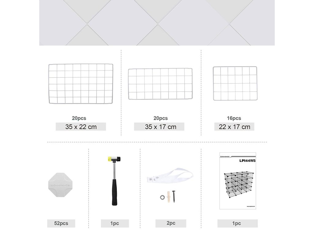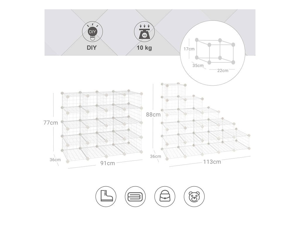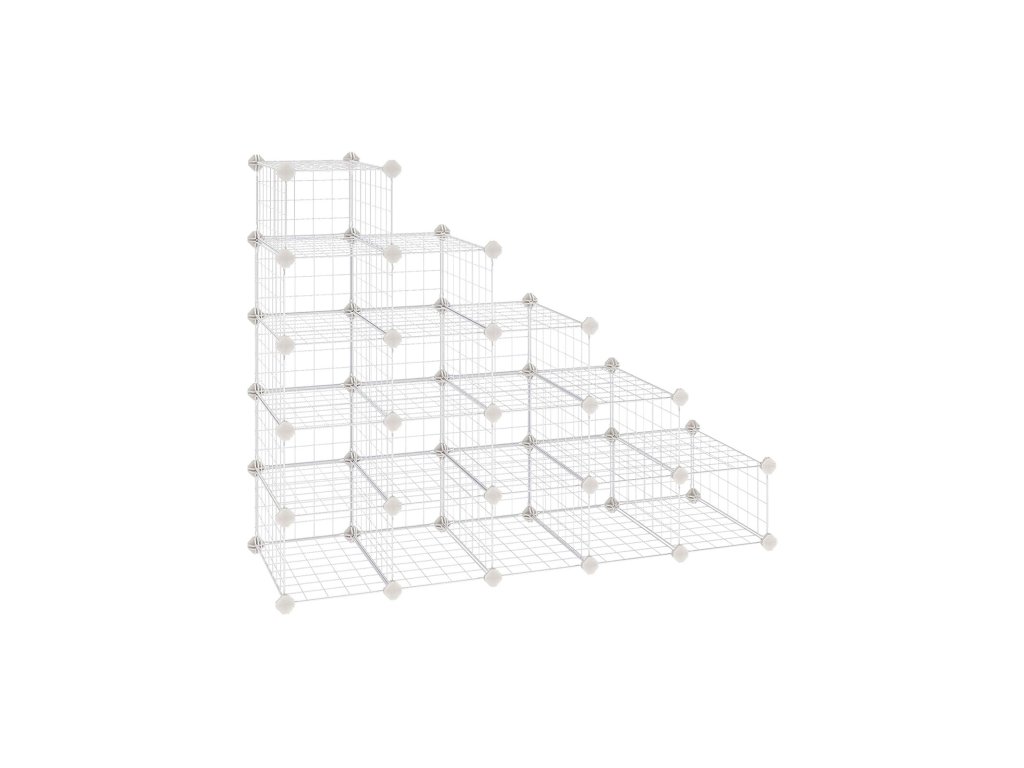 Modulární botník 15 kostek, DIY police s kovovými síťovanými panely, šatní skříň, předsíň, ložnice, včetně gumové mřížky, bílá.