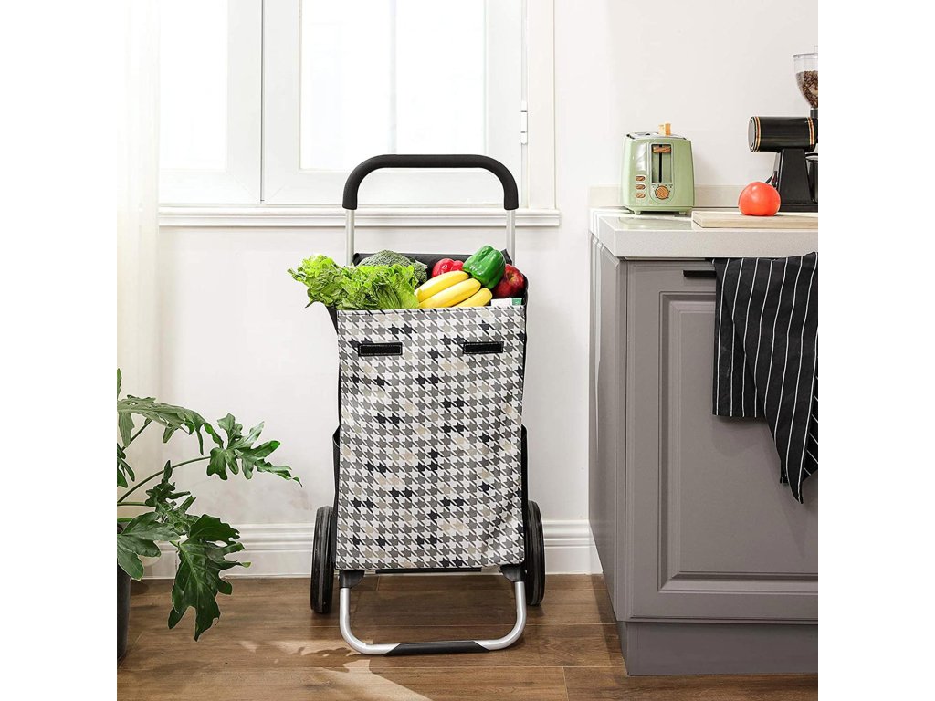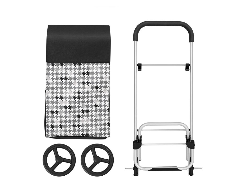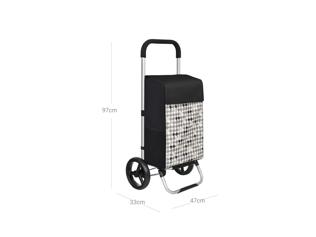 Nákupní vozík na kolečkách, nákupní košík, nosnost 40 l, s kapsami, tichá kolečka, háčky, 47 x 33 x 97 cm, vzor Houndstooth, černý.