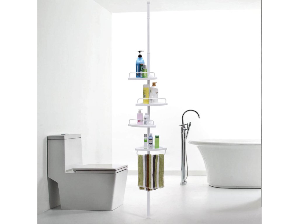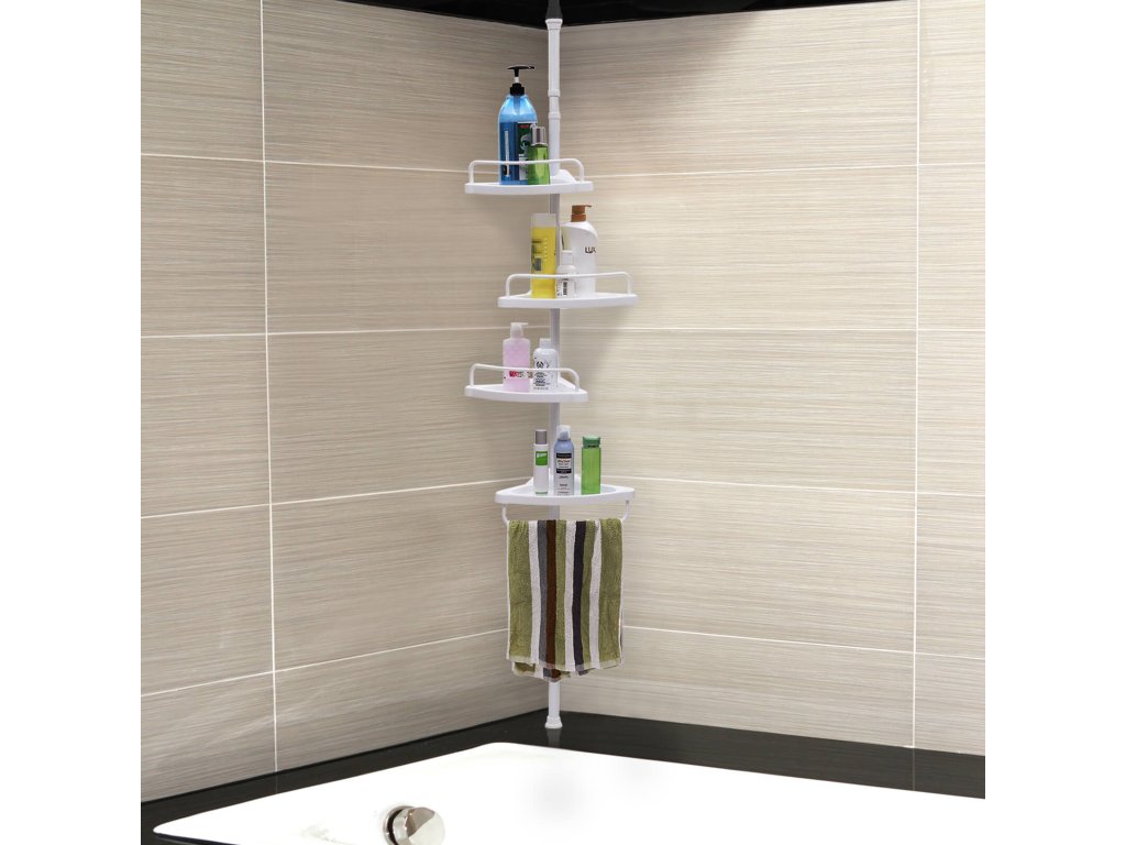 Nastavitelná rohová polička do koupelny, teleskopický držák do sprchy, 85-305 cm, od podlahy ke stropu, se 4 přihrádkami, 3 háčky, bílá.