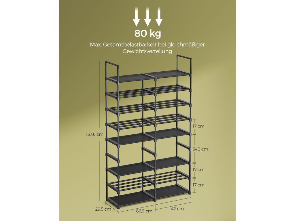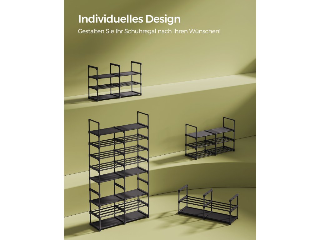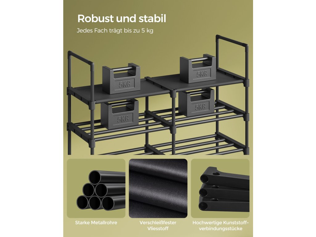 Přizpůsobivý design Rozložení stojanu na boty přizpůsobte výšce svých předmětů. Lze jej rozdělit na 2 nebo více regálů. Přizpůsobte si jej svým osobním potřebám, ať už se jedná o šatnu, garáž nebo sklad!Prostorný a všestranný Tento osmistupňový organizér na boty pojme až 32 párů bot a poskytuje dostatek úložného prostoru. Kromě bot může sloužit také jako praktická odkládací polička na krabice a tašky, což zvyšuje jeho celkovou funkčnost.Robustní a stabilní Tento odolný stojan na boty, vyrobený z vysoce kvalitních ocelových trubek a netkané textilie odolné proti opotřebení, unese až 5 kg na každou přihrádku. Přiložená sada proti překlopení zajišťuje stabilitu stojanu a zabraňuje jeho kývání.2 typy úložných polic Tento regál na boty má vrstvy z netkané textilie pro vysoké podpatky a tašky a vrstvy z ocelových trubek pro byty a krabice. Každý předmět najde na tomto univerzálním stojanu své místo!.Snadná montáž Žádné šrouby! Díky jednoduchému designu a jasným pokynům lze tento nastavitelný stojan na boty sestavit rychle a bez námahy.| Kategorie: | Botníky |