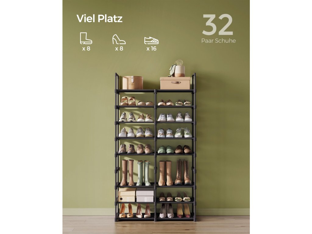 Nastavitelný stojan na boty, 8stupňový organizér na boty, police na boty, ocelové trubky a netkaná textilie, pojme až 32 párů, šetří místo, do předsíně, skříně, garáže, inkoustově černý.