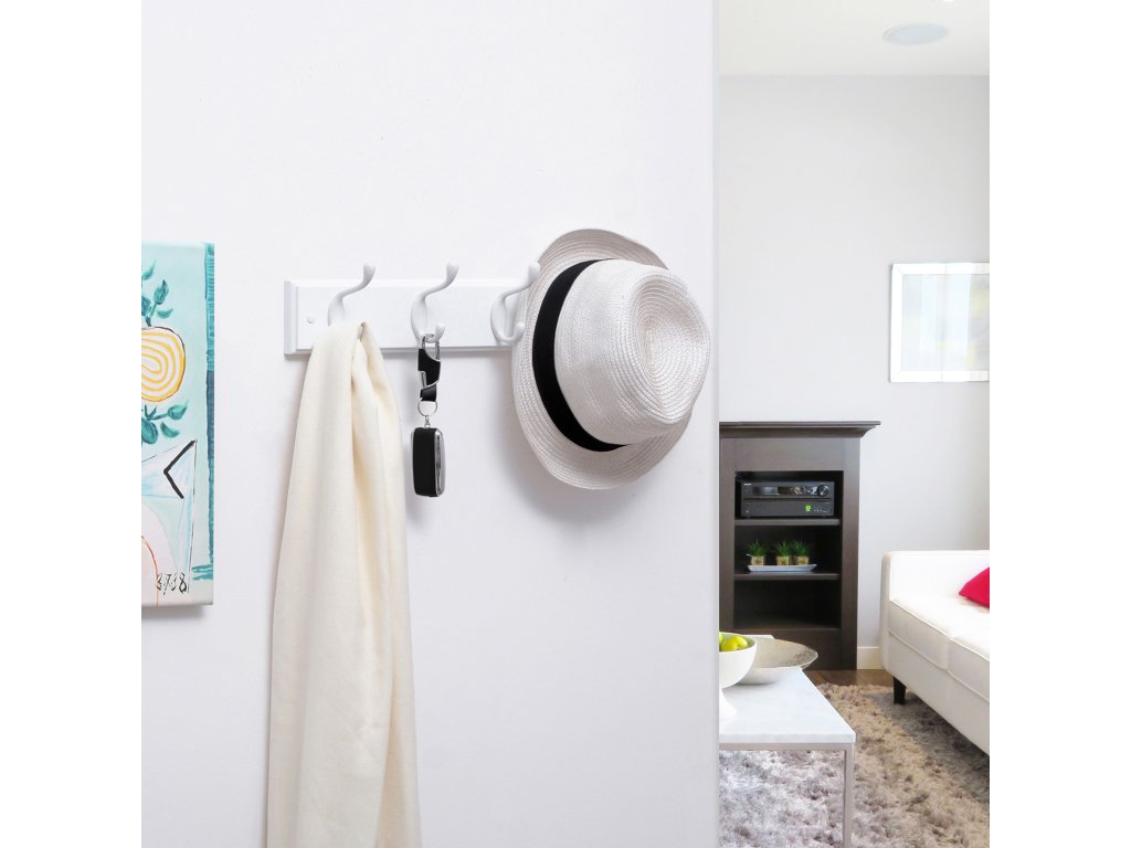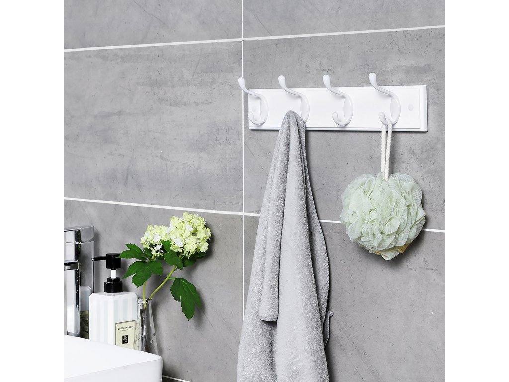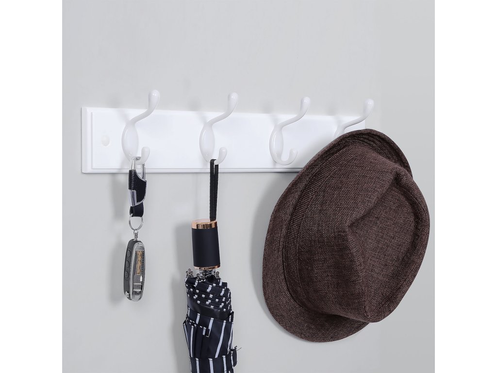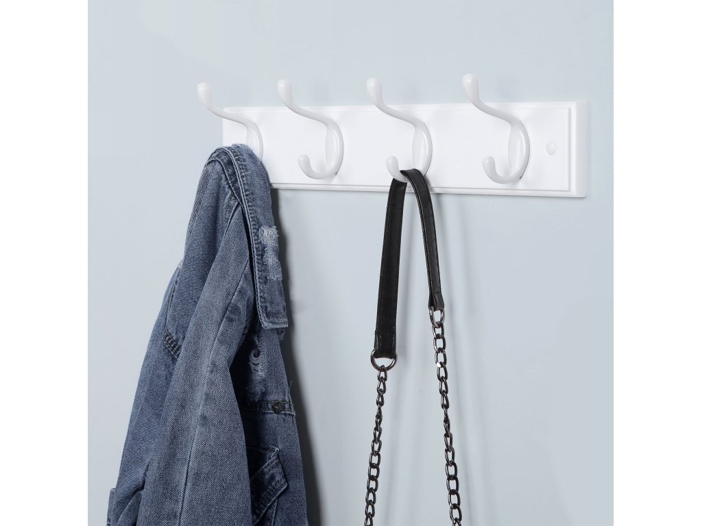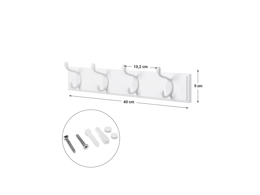 Nástěnný věšák na kabáty se 4 kovovými háčky, dřevěný nástěnný věšák na háčky do ložnice, předsíně, koupelny, bílý.