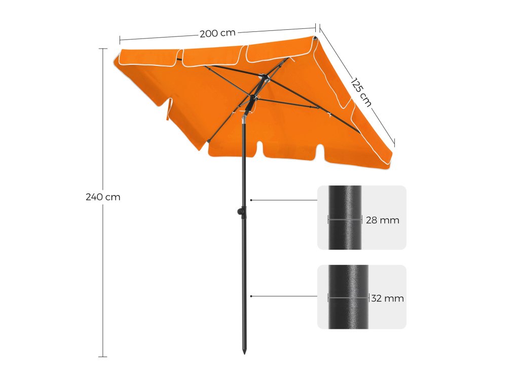 Obdélníkový balkonový slunečník 2 x 1,25 m, ochrana UPF 50+, sklápěcí slunečník, stříška s PA potahem, taška na přenášení, zahradní terasa, podstavec není součástí dodávky, oranžová.