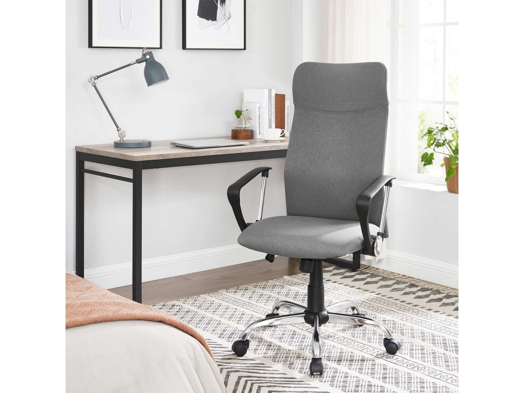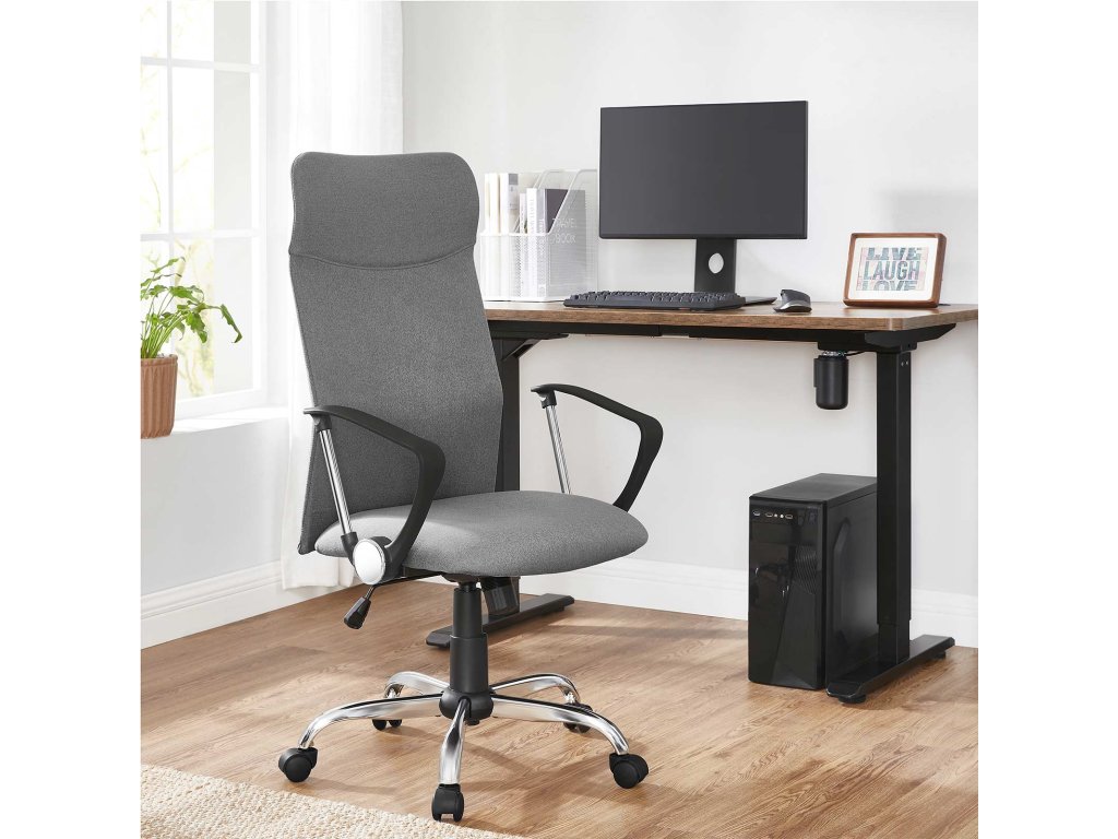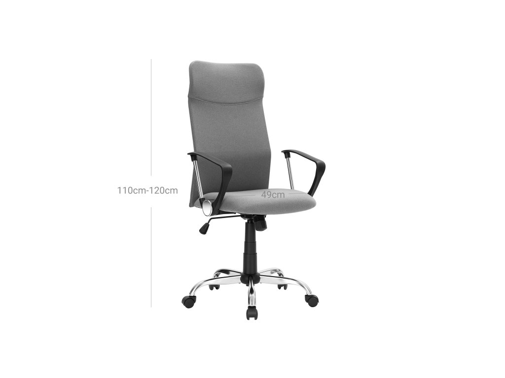 Kancelářská židle, ergonomická otočná židle, polstrovaný sedák, látkový potah, výškově nastavitelná a naklápěcí židle s nosností až 120 kg, šedá barva.