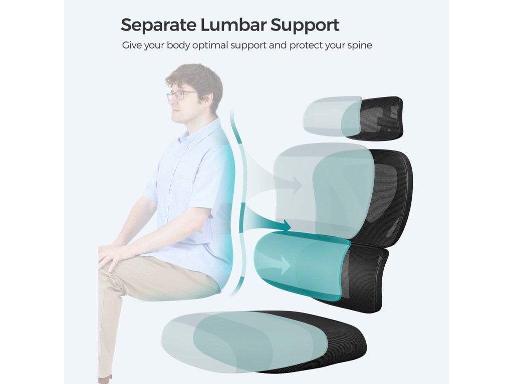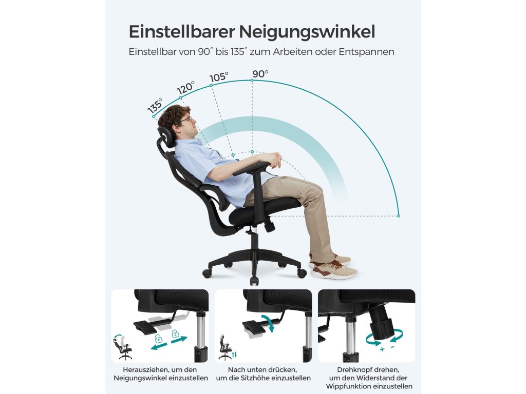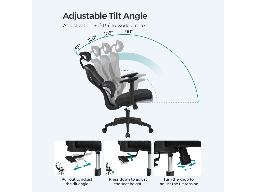 Samostatná bederní opěrka: tato kancelářská židle má samostatnou bederní opěrku s ergonomickým designem, která se přizpůsobí vašemu tělu a zajistí vám pohodlí při práci. i když dlouho sedíte.Vícenásobné nastavení: opěrku hlavy otočné židle lze otočit až o 30°, opěradlo ve tvaru S lze nastavit v úhlu 90°, 105°. 120° a 135° pro snížení tlaku na vaše tělo a zaujmutí nejpohodlnější polohy při sezení.