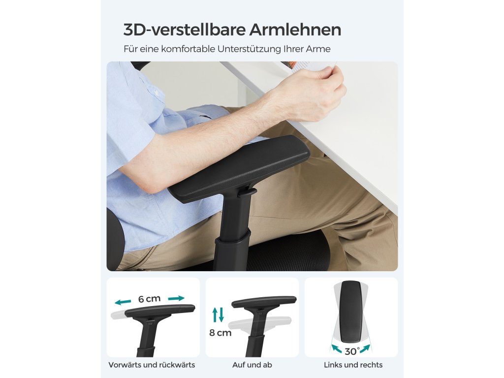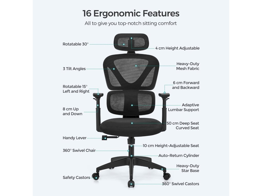 Vysoký komfort sezení: tato židle je polstrovaná rozměrově stabilní pěnou, u které byla nalezena rovnováha mezi měkkostí a tvrdostí. prodyšná síťovaná opěrka zad s kovovým rámem vás v horkých letních dnech ochladí.Bezpečnostní kolečka a dobrá odolnost: kolečka s brzdami závislými na zatížení udržují síťovou židli stabilní, takže při vstávání neklouže. Při sezení se můžete otáčet dopředu a dozadu, díky robustní základně unese židle až 150 kg.