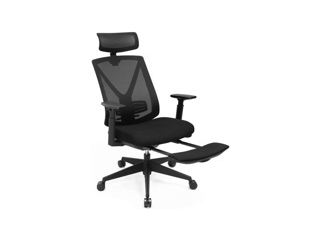 Ergonomická kancelářská židle s podnožkou, kancelářská židle s bederní opěrkou, nastavitelnou opěrkou hlavy a područek, nastavením výšky a funkcí houpání, maximální nosnost 150 kg, černá.