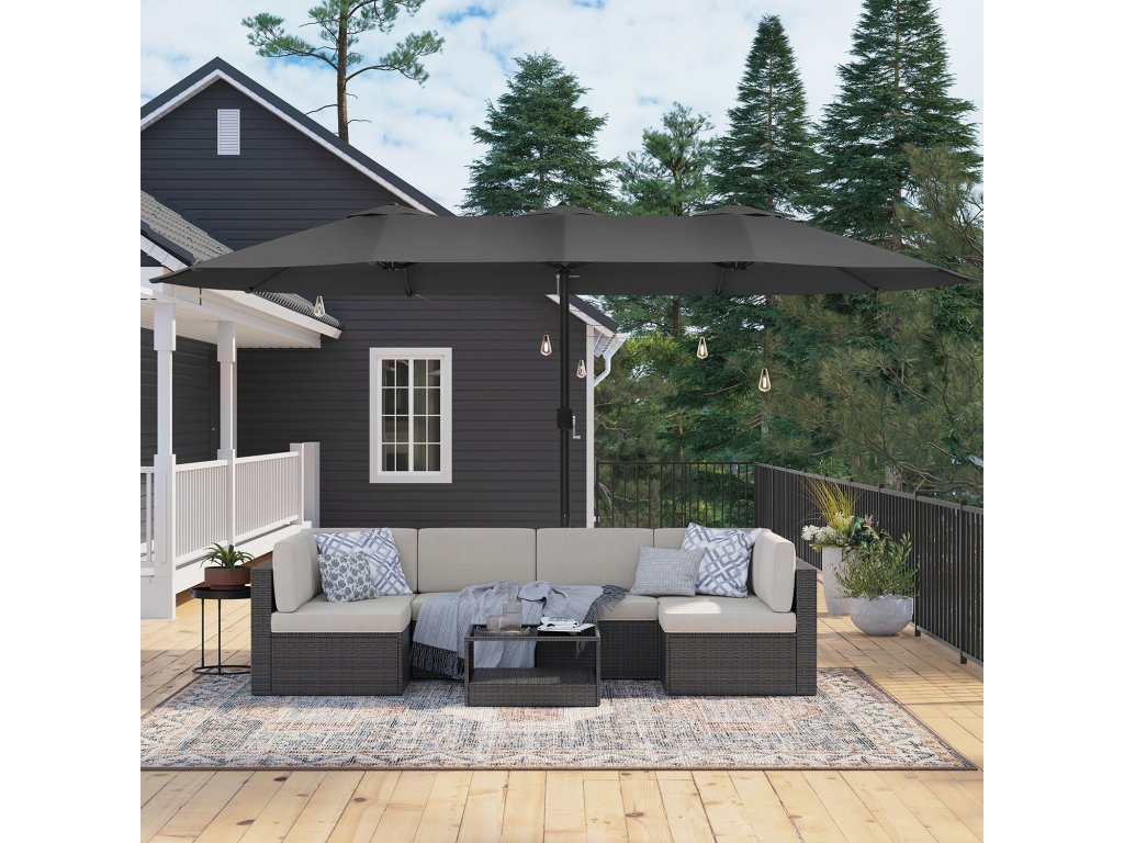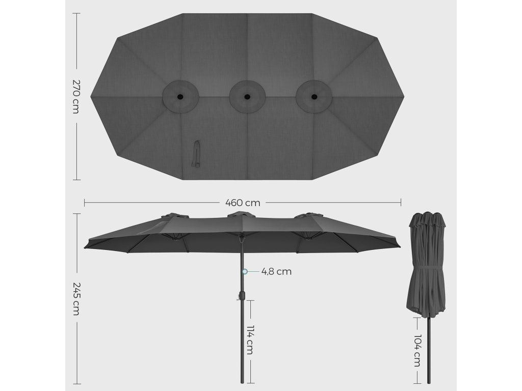 Skupina přátel? Vítejte! Tento oboustranný terasový slunečník o rozměrech 460 x 270 cm nabízí velké venkovní prostory - od terasy až po komerční akce. Pořádáte na zahradě grilovací párty? Tady to je. Venkovní posezení pro kavárny a restaurace? To je samozřejmost.