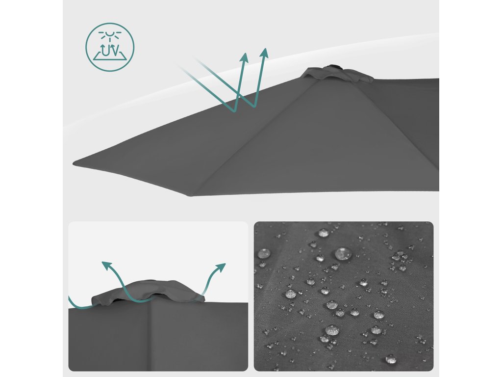 Hořící slunce? Už se nemusíte bát! Stříška nabízí vynikající ochranu proti slunci UPF 50+. blokuje 98 % UV záření a chrání vaši pokožku i v těch nejteplejších hodinách - užijte si venkovní zábavu pod tímto dvojitým terasovým slunečníkem.