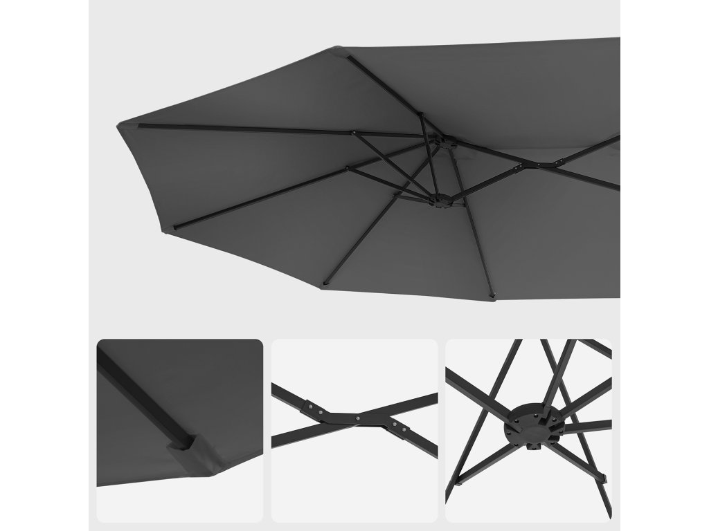 Je robustní? To si pište! Má 12 kovových žeber o rozměrech 12 x 18 mm a odolnou kovovou tyč s práškovým nástřikem o průměru 48 mm. tento robustní zahradní slunečník vám bezpečně nabídne vaši osobní letní oázu.