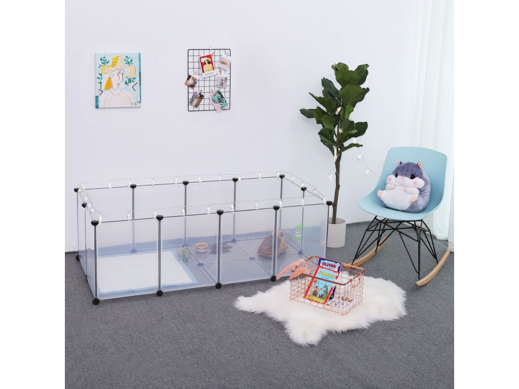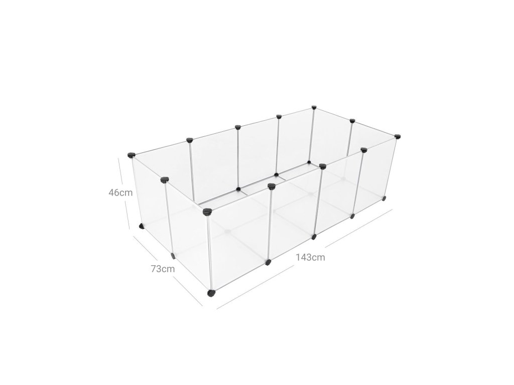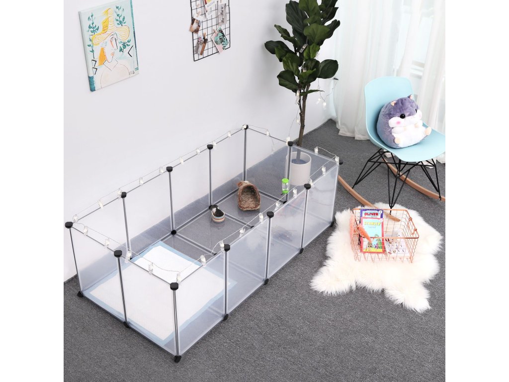 Montáž je hračka Jednoduše spojte plastové panely pomocí víceúhelníkových konektorů s pomocí přiložené gumové paličky a rychle sestavte tuto ohrádku pro domácí mazlíčky; modulární, lehká konstrukce také umožňuje snadnou demontáž nebo přemisťování;Prostorný a bezpečný Tento výběh pro domácí zvířata nabízí prostorný prostor pro morčata, křečky, ježky nebo králíky, kde mohou běhat, zkoumat a bavit se; hladké, 46 cm vysoké plastové stěny jim dávají jen malou šanci vylézt ven;Preventivní detaily Podlaha této klece pro křečky nejen zvyšuje stabilitu, ale také nabízí účinnou ochranu vašich podlah; kolem spojů plastových panelů a konektorů nejsou žádné mezery, kterými by se mohli prokopat malí živočichové;Plně přizpůsobitelné Vytvořte si tvar písmene L, abyste si přizpůsobili prostor, poskládejte panely na sebe a přidejte druhé patro, připojte střechu (vše v rámci dodávaných dílů). nebo můžete zkombinovat 2 sady a postavit vyšší nebo větší domeček pro vaše chlupáče - záleží jen na vás!Průhledné a snadno čistitelné Průhledné plastové panely vám umožní sledovat a komunikovat s vašimi malými chlupatými přáteli; když se výběh pro morčata zašpiní, stačí ho otřít vlhkým hadříkem;| Kategorie: | Klece pro hlodavce |