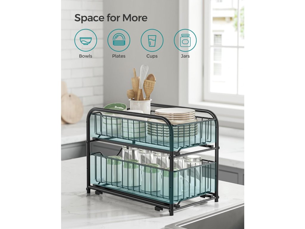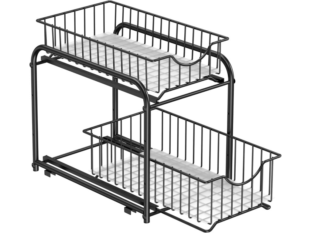 Organizér do skříněk, dvoupatrový organizér pod umyvadlo s posuvnými zásuvkami, stohovatelný organizér do skříňky pro kuchyň, koupelnu, klasická černá.