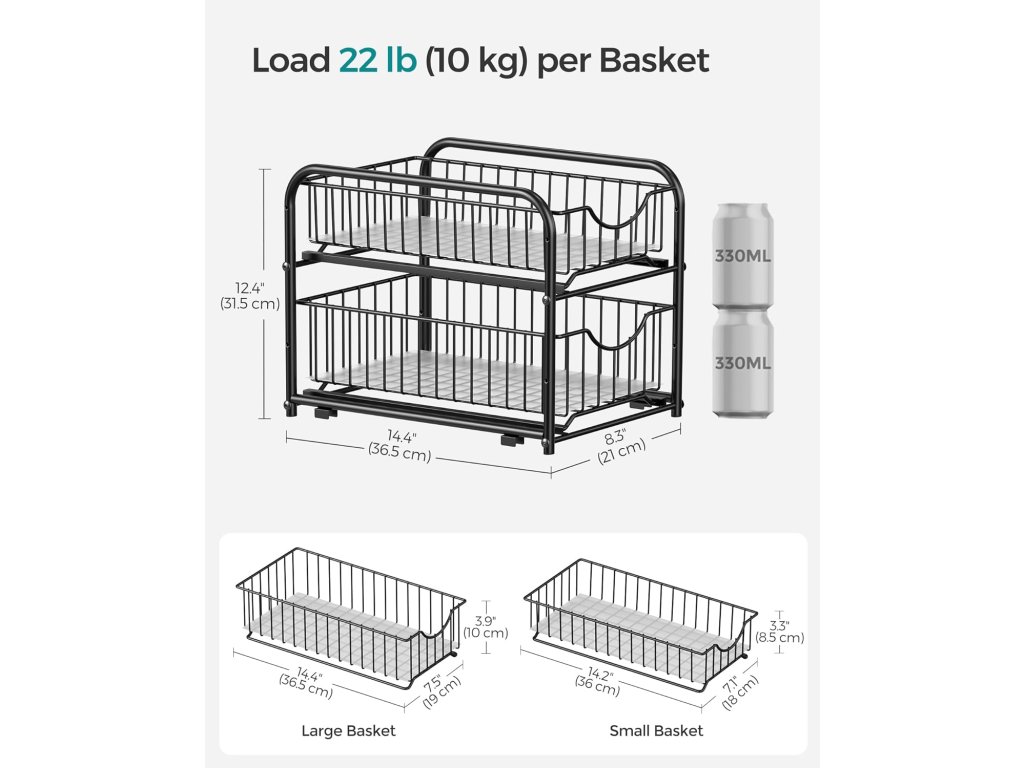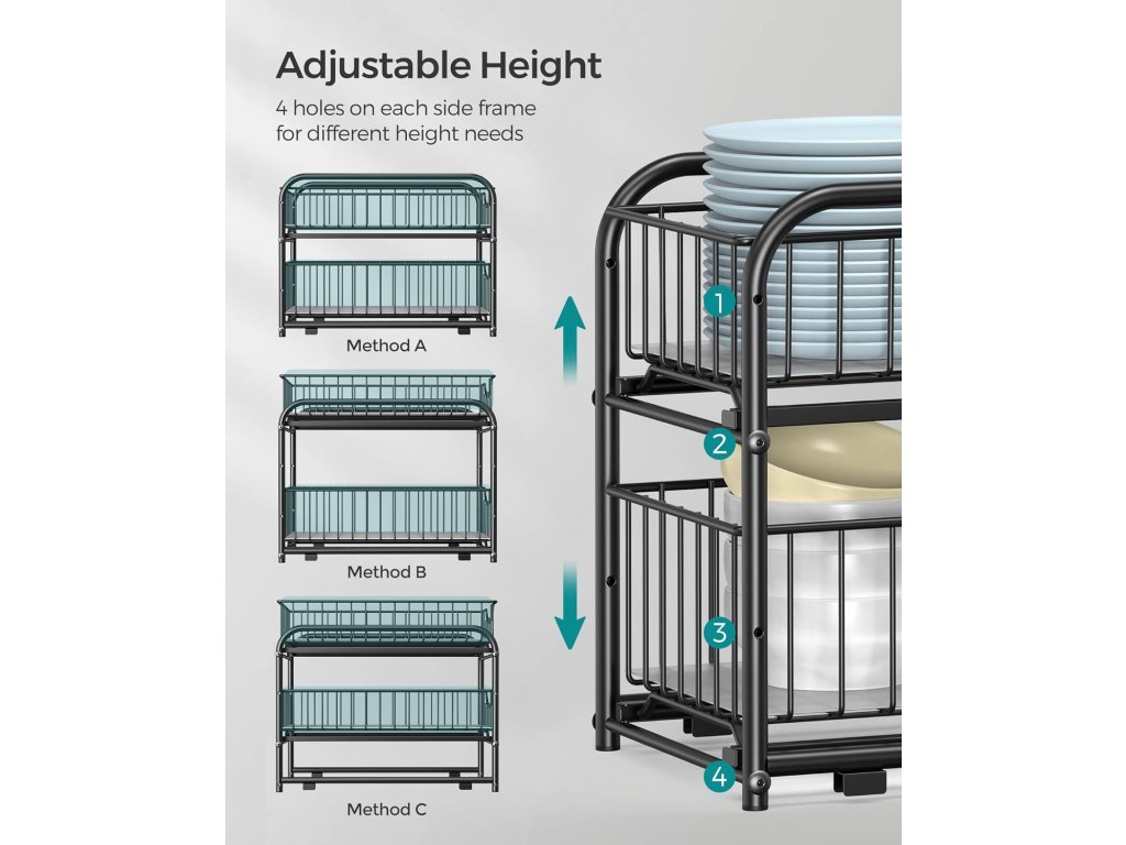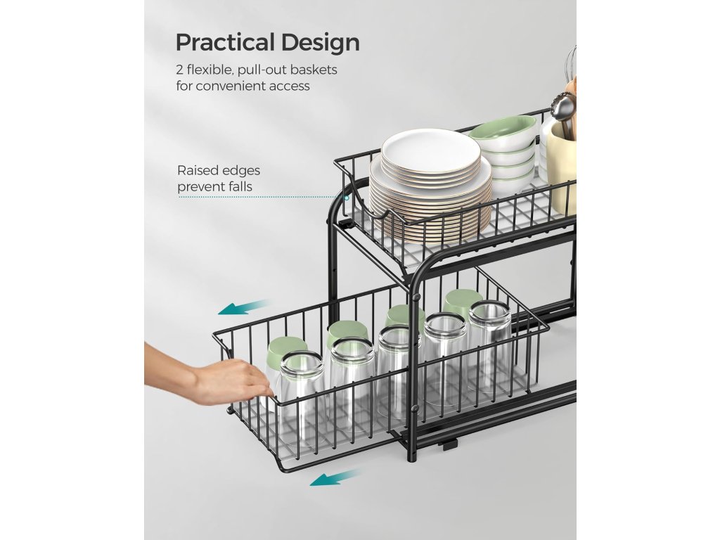 Palec nahoru za všestrannost Udělejte si z něj výsuvný organizér do skříněk, abyste zkrotili zboží ve spíži, nebo si vytvořte praktické místo pod kuchyňským dřezem na čisticí prostředky, případně ho použijte jako nerezový stojan v koupelně na mýdla a pečující potřeby. Hurá na všestrannost!.Přizpůsobitelné Díky 4 otvorům na každé straně bočního rámu jsou 2 koše výškově nastavitelné podle potřeby. Díky stohovatelné konstrukci můžete pozvat více regálů, naskládat je na sebe a plně využít vertikální prostor.Najděte pohodlí v detailech Pro ty, kteří hledají pohodlný úložný prostor, jsou tyto 2 výsuvné zásuvky s koši, které usnadňují přístup ke všemu, aniž by museli hrabat. Každá zásuvka je také vybavena PP fólií pro větší stabilitu drobných předmětů a snadné čištění.Snadná montáž Tato police na kuchyňskou linku je dodávána se snadným návodem, označenými díly a montážním nástrojem, takže ji budete mít připravenou k obnovení čistého prostoru na lince dříve, než se nadějete.Co získáte Dvoupatrový organizér do skříně vyrobený z robustní oceli se 4 protiskluzovými plastovými podložkami pod nohy, které chrání vaši pracovní desku před případným poškrábáním a dodávají jí větší stabilitu. a 2 výsuvné zásuvky s koši, do kterých můžete uložit věci a rychle je vzít a odnést.| Kategorie: | Organizace kuchyně |