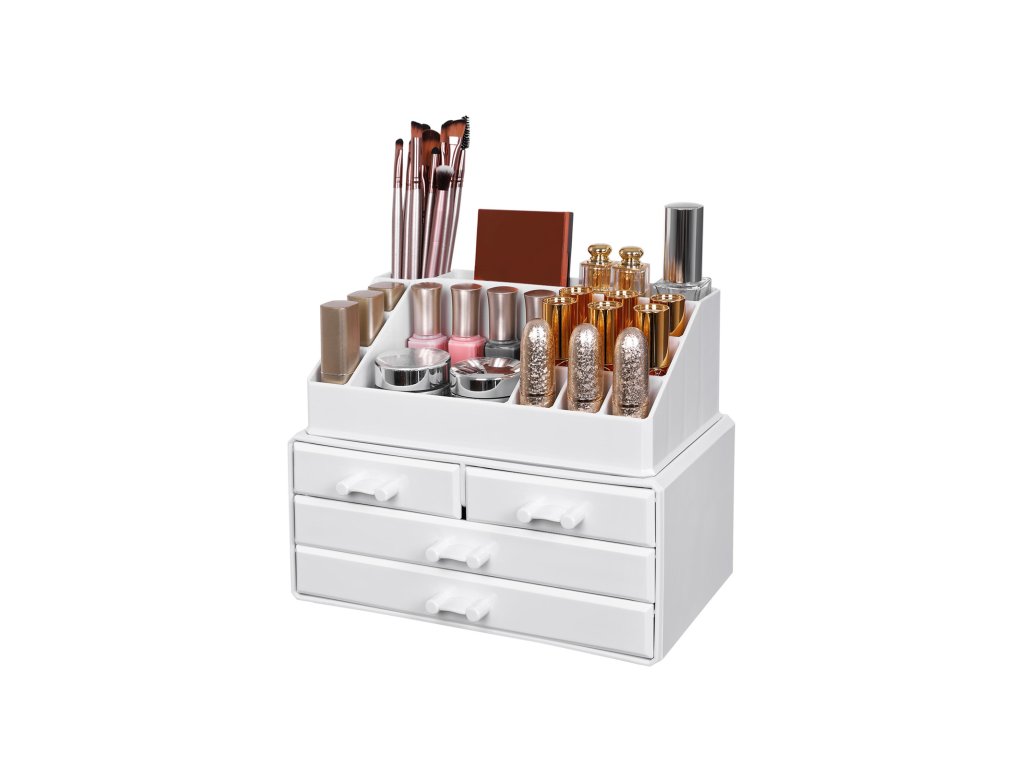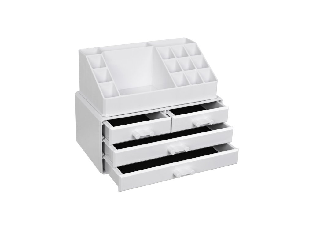 Velmi funkční, úložný zázrak. Lze jej použít k uložení velkého množství tříděného nádobí. V horní části je 16 přihrádek, do kterých můžete uložit rtěnky, úložné zázraky - může tam být různé náčiní. Do horních 16 přihrádek můžete umístit rtěnky, laky na nehty, štětce na make-up, řasenku, tužky na obočí, oční linky atd. zatímco šperky nebo různá líčidla v různých velikostech můžete uložit do spodní přihrádky.