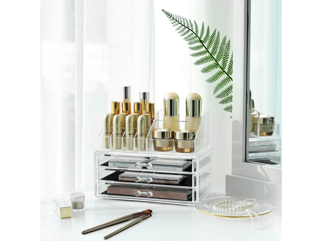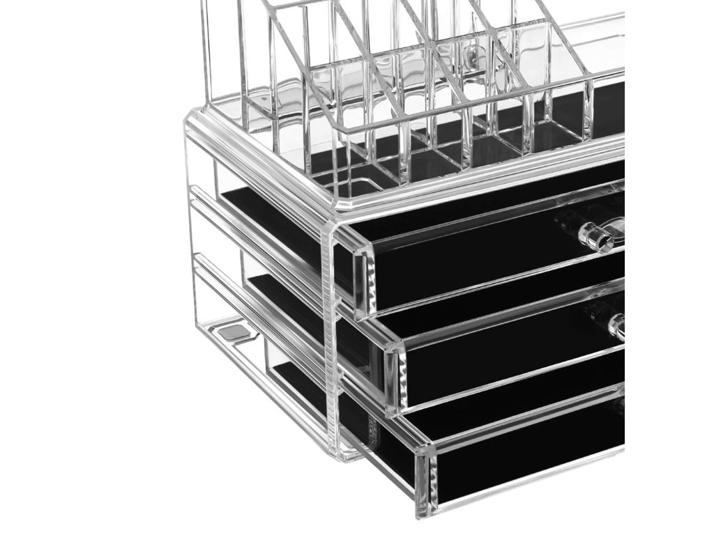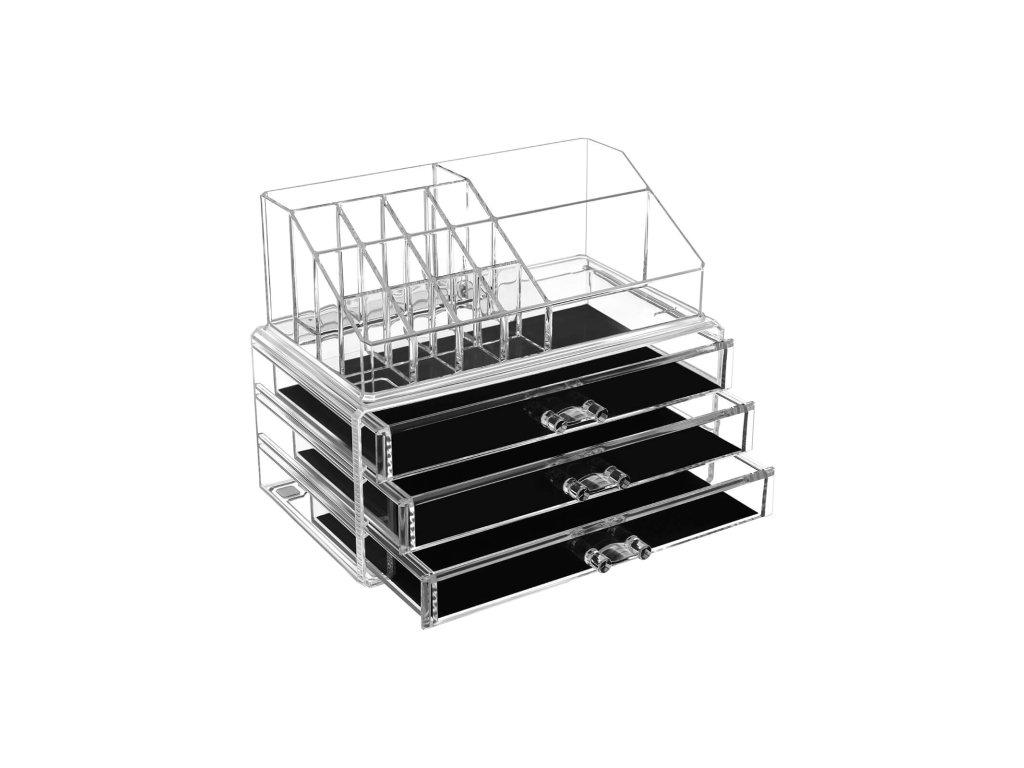 Úložiště, které lahodí oku: Rozměry: 24 x 13,5 x 18,5 cm (d x š x v) tento průhledný organizér na kosmetiku pojme všechny vaše kosmetické pomůcky a zároveň si můžete přehledně uspořádat kosmetiku na jednom místě.Vše je v pořádku: Vaše rtěnky, laky na nehty a řasenku v 15 přihrádkách nahoře a oční stíny a náramky ve 3 zásuvkách dole - veškerá kosmetika zde najde své místo.2 v 1? Nebo 1 na 1? Tento organizér na make-up se skládá ze 2 kusů. Spodní díl můžete snadno oddělit od horního a používat je samostatně, nebo je nechat poskládané na sobě, abyste ušetřili místo - volba je na vás!