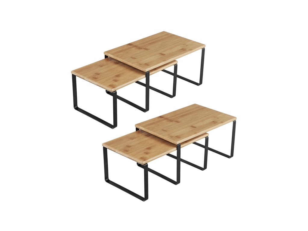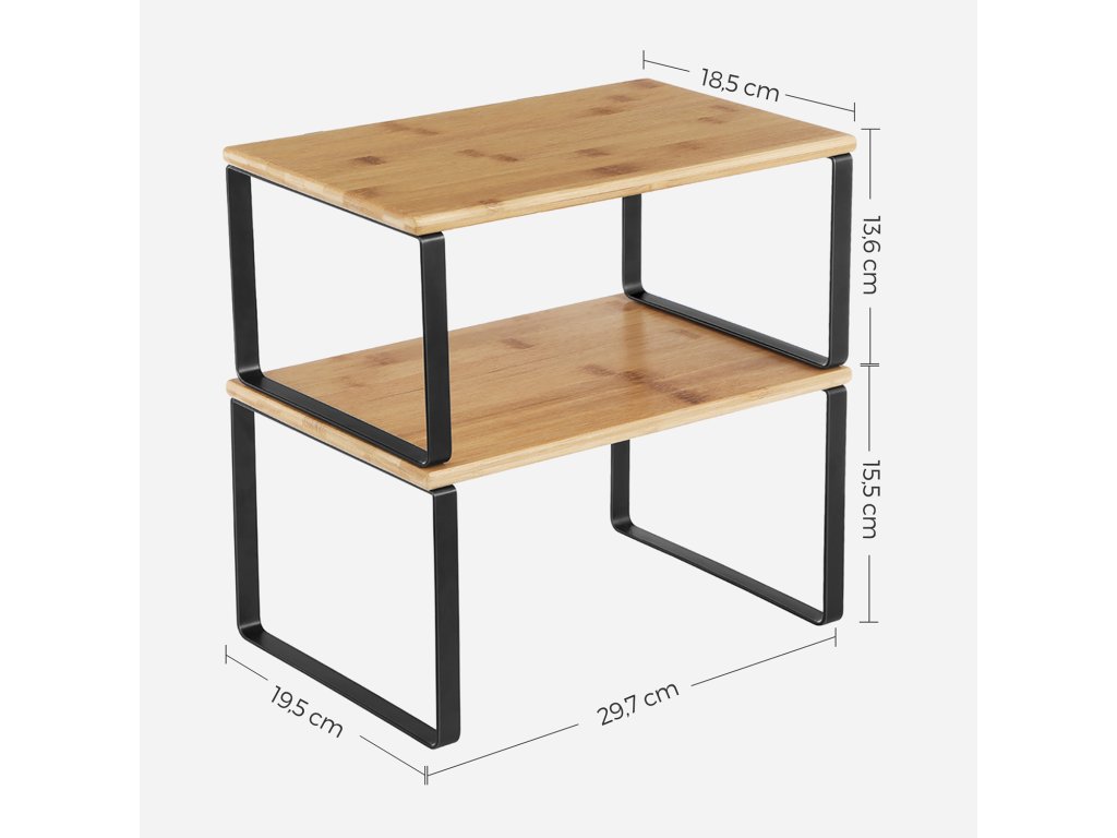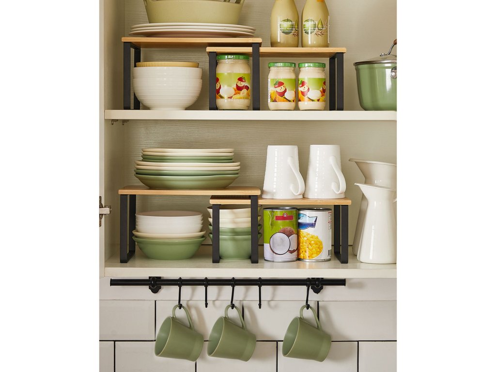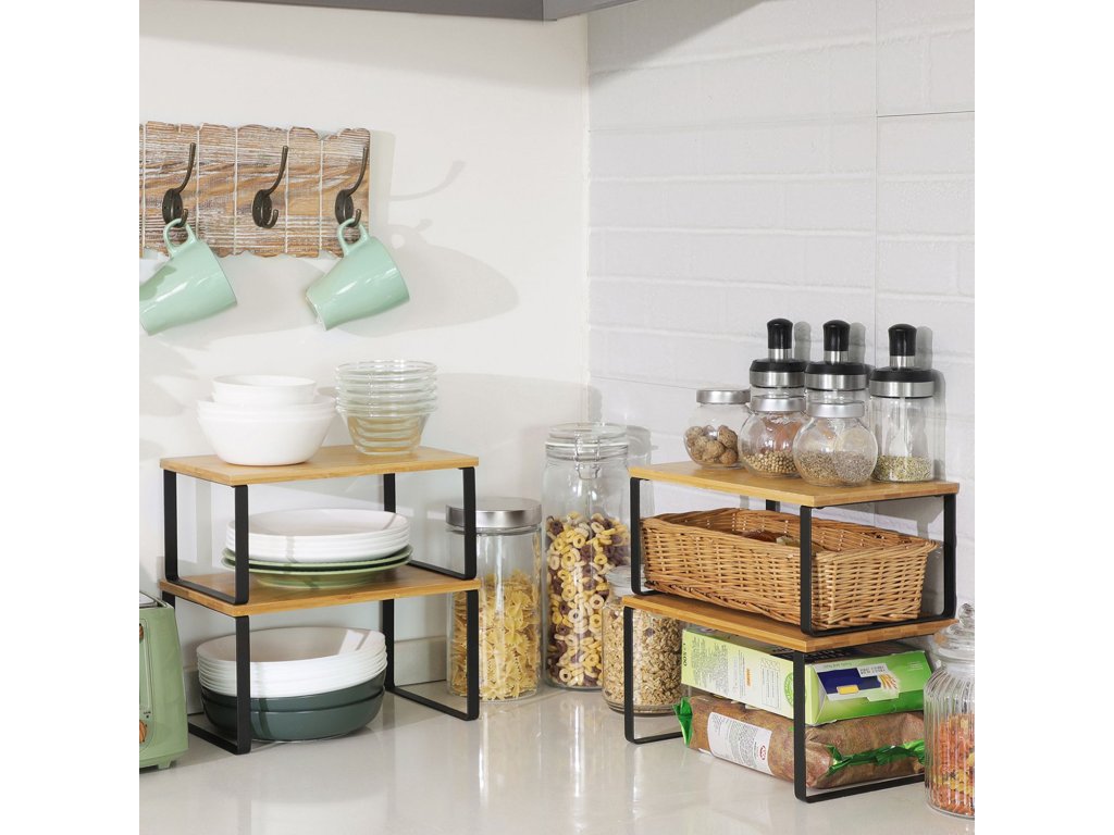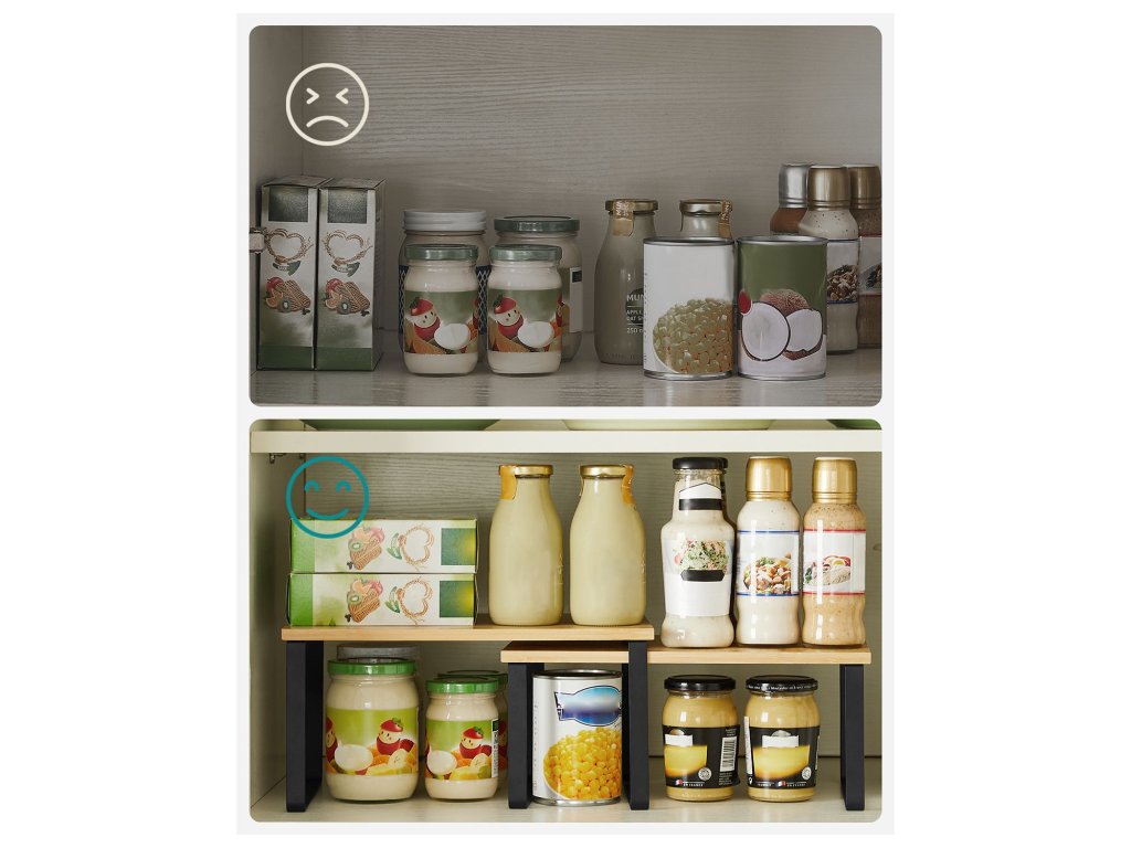 Slouží na mnoha místech Postavte je na kuchyňskou linku jako stojan na koření, umístěte je do skříňky, abyste maximalizovali prostor. nebo je použijte ve spíži, abyste zkrotili všechny chaotiky - tyto 4 kuchyňské úložné regály splňují všechny požadavky.Příjemné na pohled Díky přírodním bambusovým deskám a černým kovovým rámům dodají tyto pultové police vaší kuchyni svěží nádech.Malá police, obrovská síla Ačkoli jsou tyto kuchyňské organizéry malé a mají jednoduchou konstrukci, jsou dostatečně výkonné, aby každý z nich unesl až 15 kg; nechte jim kávové náčiní nebo lis na panini - zvládnou to.Nahoru, dolů, doleva, doprava Umístěte 4 police na sebe, vedle sebe nebo do tvaru L, aby vyhovovaly vašemu prostoru; díky chytrému přizpůsobitelnému designu je jediným omezujícím faktorem vaše představivost.Co je v krabici 4 stylové organizéry do kuchyňských skříněk, které umožňují jejich stohování, rozšíření nebo rozdělení na různá místa, a skvělý nápad, jak maximalizovat prostor ve skříňce nebo na lince.| Kategorie: | Organizace kuchyně |