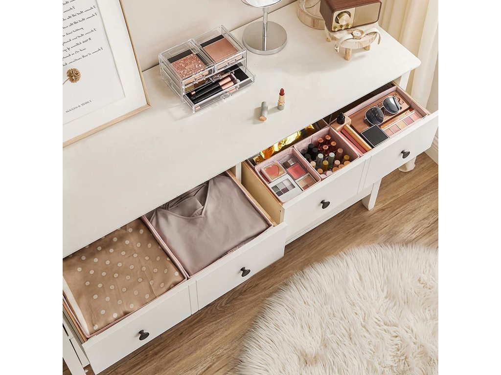 Méně času při hledání: Drobné věci se snadno povalují volně ve skříních nebo zásuvkách; uložte je do této sady 6 boxů pro uspořádání zásuvek, abyste je mohli všechny přehledně seřadit a vybírat, aniž byste se museli přehrabovat v nepřehledné hromadě;Skladování, které vyvolává radost: Podprsenky ukládejte do velkých krabic, spodní prádlo do středních a ponožky do malých; tyto úložné boxy vám pomohou roztřídit opasky, punčocháče, dětské oblečení nebo jiné jednoduché věci a udělají z vašeho domova uklizené a zábavné místo;Kombinace pro chytré mozky: Sada obsahuje 2 velké kostky (28 x 28 x 13 cm), 2 střední krabičky (28 x 14 x 13 cm) a 2 malé krabičky (14 x 14 x 13 cm), stačí je rozložit do zásuvek. oddělit je na policích nebo je umístit pod stoly.Další možnosti: Ačkoli jsou kostky malé a jednoduché, zrodily se s nekonečnými možnostmi; uspořádat make-up na toaletním stolku, uložit drobnosti do zásuvek, použít jako dětské koše v komodě dítěte nebo na nářadí v řemeslné dílně, to je vaše práce;Co získáte: 6 organizérů do zásuvek ve velkých, středních a malých velikostech, skládací konstrukce pro skladování na plocho a všestranná možnost, jak udržet pořádek ve vaší domácnosti.| Kategorie: | Úložné boxy |