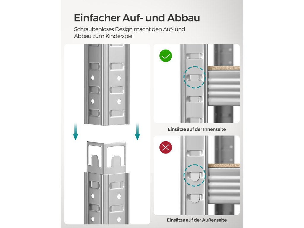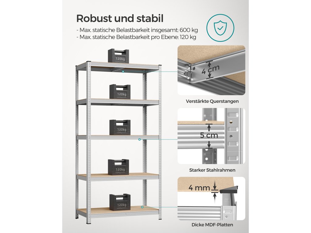 Heavy-Duty & Stable Tato sada 2 garážových regálů je vyrobena z ocelových rámů a každá úroveň unese až 120 kg. Přiložené sady proti překlopení pomohou připevnit regály ke stěně, takže jsou stabilnější a bezpečnější.Dělitelné Každý kovový regál lze rozdělit na 2 samostatné jednotky, aby vyhovoval vašim potřebám a prostoru; po rozdělení se skvěle hodí i jako pracovní stoly s úložným prostorem.Nastavitelné police Každou úroveň lze snadno nastavit každých 5 cm, což vyhovuje vašim potřebám ukládání předmětů různých velikostí.Velká velikost, velká nosnost Regálová jednotka o rozměrech 50 x 100 x 200 cm a celkové nosnosti 600 kg může být použita v garáži, skladu, sklepě. nebo technická místnost pro uspořádání veškerého nářadí a vybavení.Snadná montáž bez použití nářadí Tyto odolné regály se snadno montují bez použití nářadí díky vzájemně propojené konstrukci a jasným pokynům.| Kategorie: | Regály a poličky |