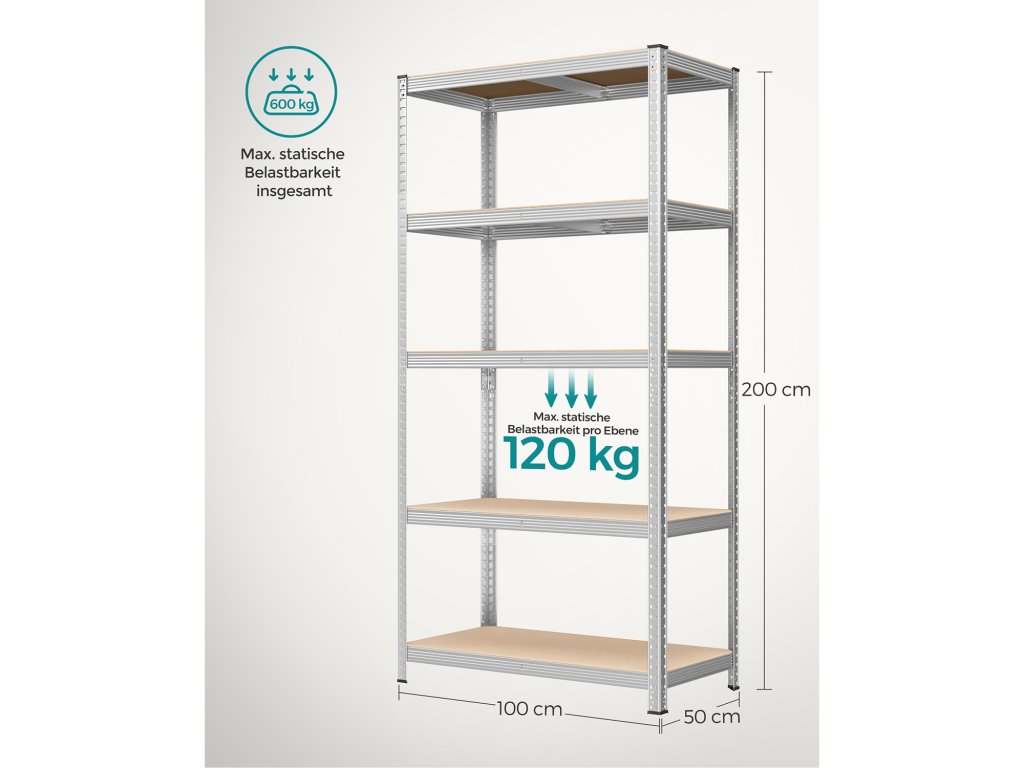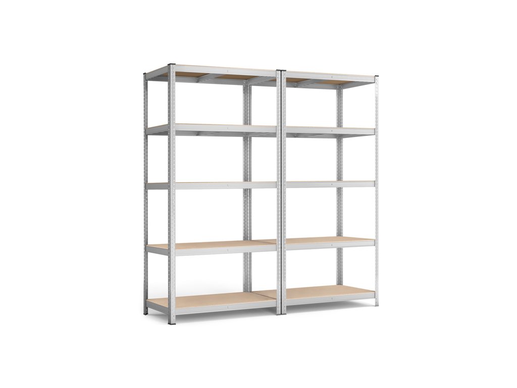 Pětipatrové regály, sada 2 ocelových regálů pro skladování, montáž bez nářadí, do garáže, kůlny, nosnost 600 kg, 50 x 100 x 200 cm, stříbrná.