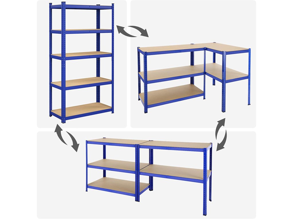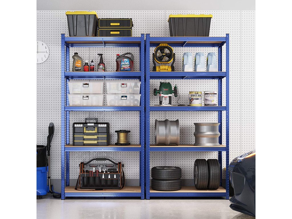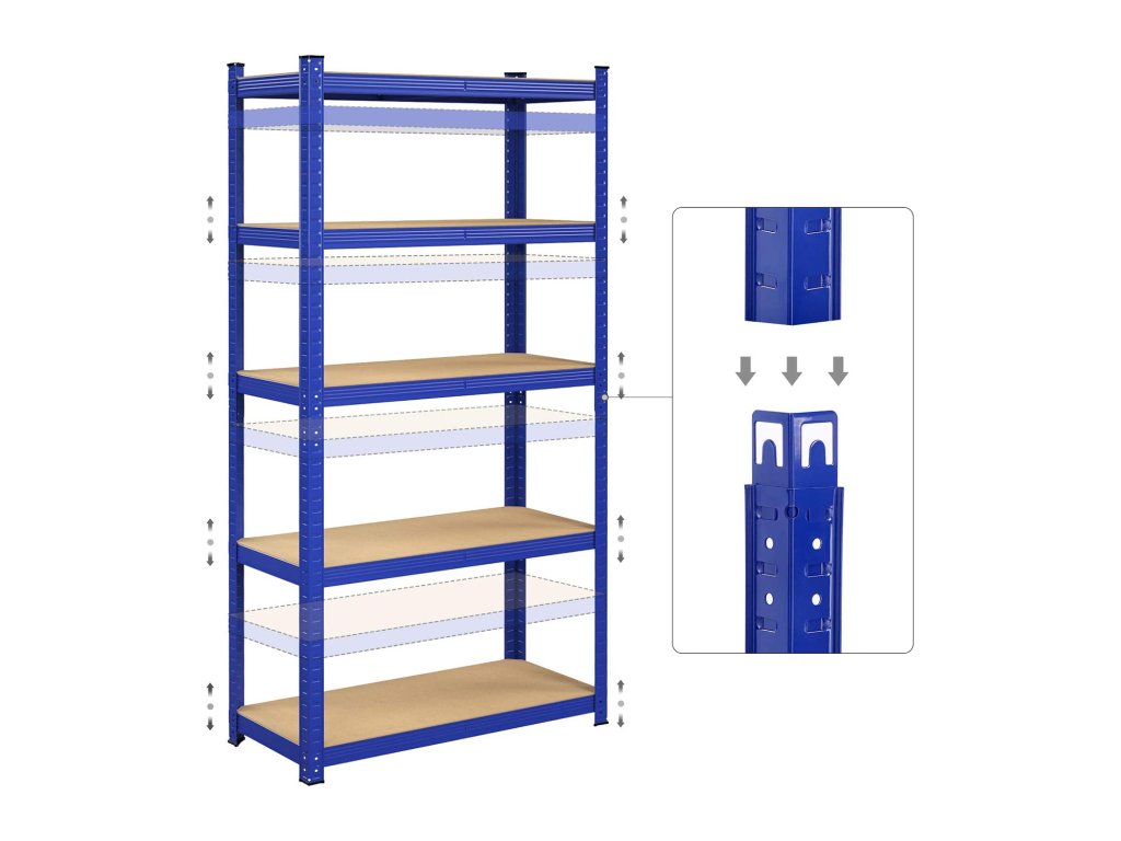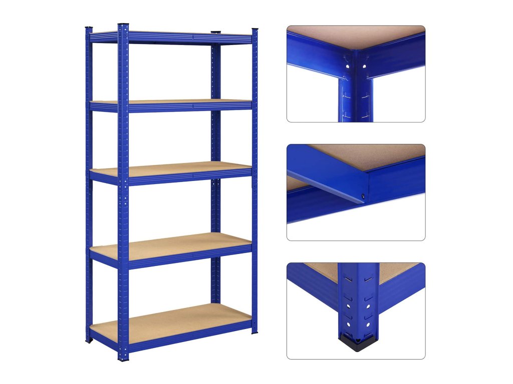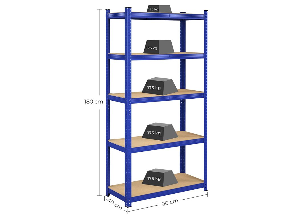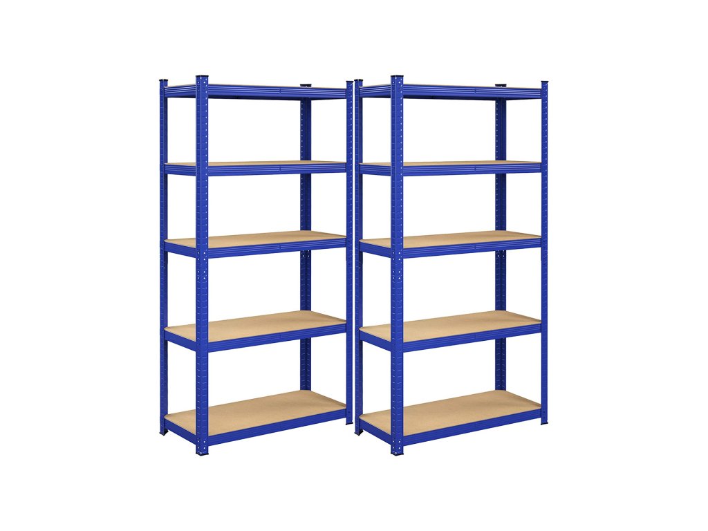Pětipatrové regály, sada 2 ocelových regálů pro skladování, montáž bez nářadí, do garáže, kůlny, nosnost 875 kg, 40 x 90 x 180 cm, modrá.