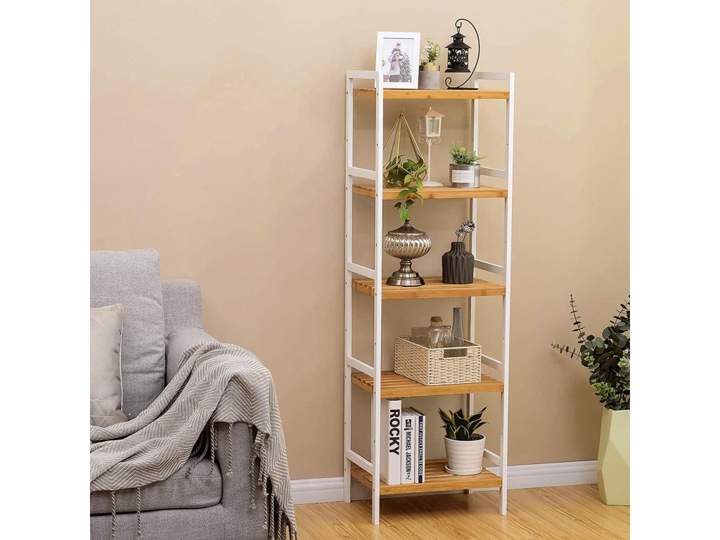 Pětipatrový bambusový regál do koupelny, kuchyně, ložnice, 31,5 x 45 x 142 cm, přírodní a bílý.