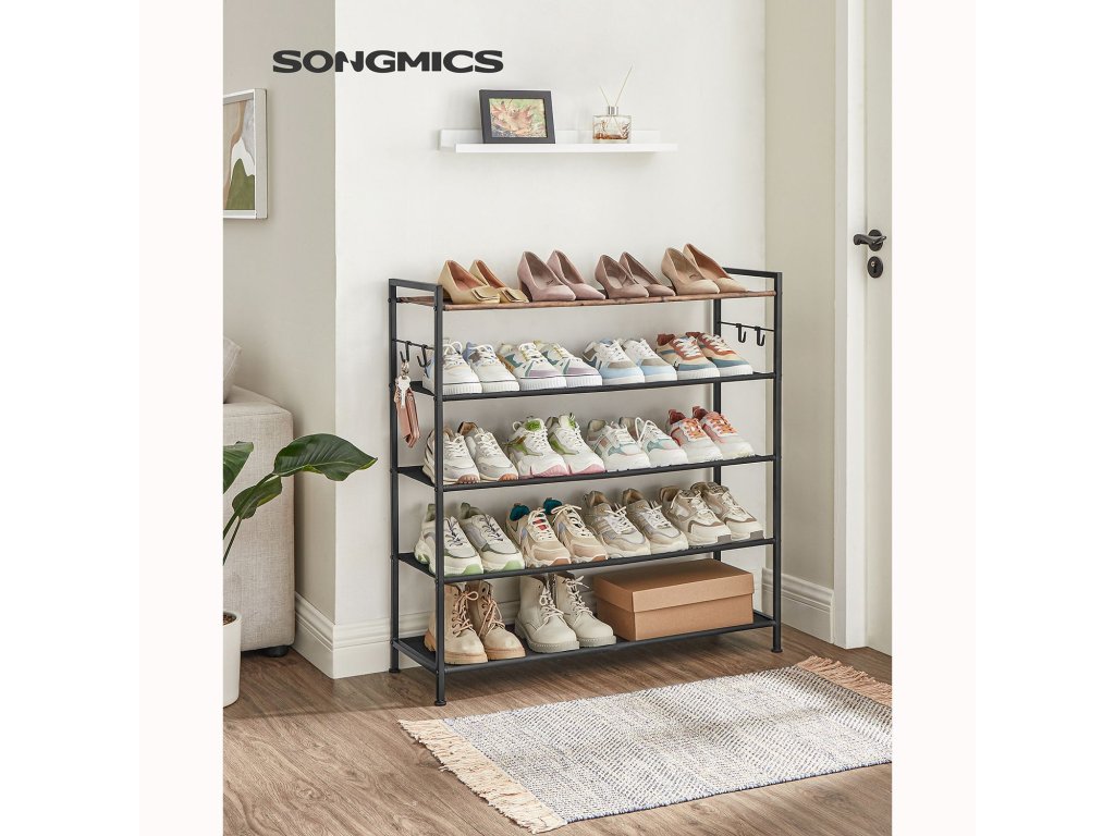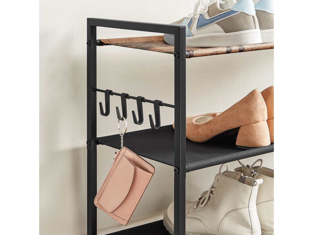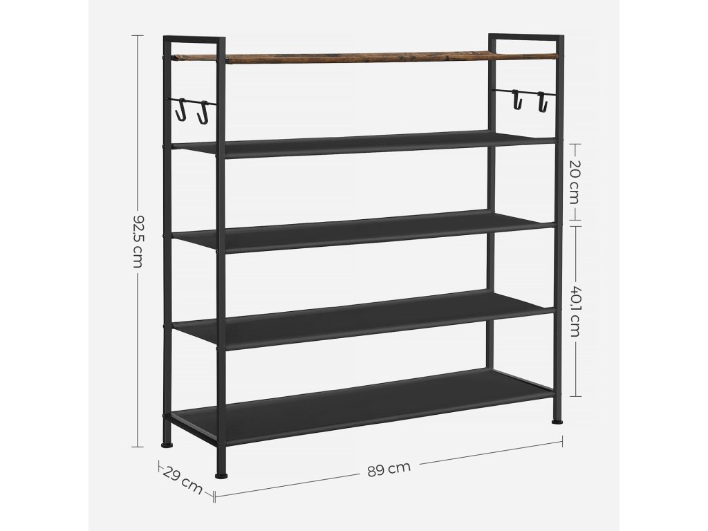 Pětipatrový botník, kovový regál na boty, police z oxfordské tkaniny, pro 20-25 párů bot, 29 x 89 x 92,5 cm, 4 háčky, otevřený botník do předsíně ložnice, rustikální hnědá a černá.