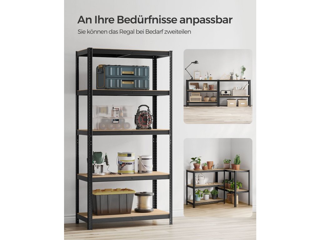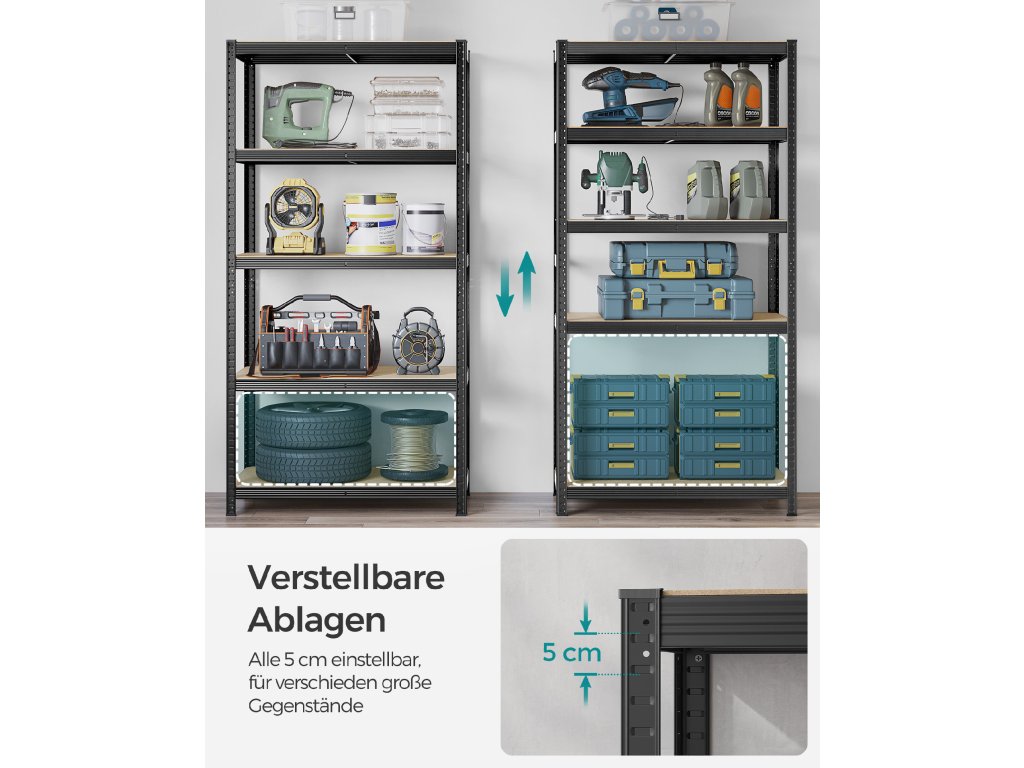 Heavy-Duty & Stable Tento garážový regál má ocelový rám a každá úroveň unese až 120 kg. Přiložená sada proti překlopení pomůže připevnit regálovou jednotku ke stěně, takže bude stabilnější a bezpečnější.Dělitelný Tento kovový regál lze rozdělit na 2 samostatné jednotky, aby vyhovoval vašim potřebám a prostoru; po rozdělení se skvěle hodí i jako pracovní stoly s úložným prostorem.Nastavitelné police Každou úroveň lze snadno nastavit každých 5 cm, což vyhovuje vašim potřebám ukládání předmětů různých velikostí.Velký rozměr, velká nosnost Tento regál o rozměrech 50 x 100 x 200 cm a celkové nosnosti 600 kg lze použít v garáži, skladu, sklepě. nebo technická místnost pro uspořádání veškerého nářadí a vybavení.Snadná montáž bez použití nářadí Tento odolný regál se snadno montuje a nevyžaduje žádné nářadí díky vzájemně propojené konstrukci a jasným pokynům.| Kategorie: | Regály a poličky |