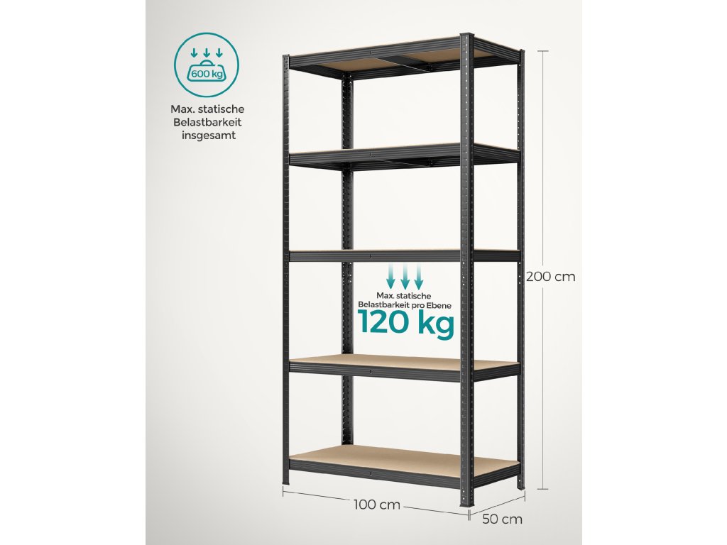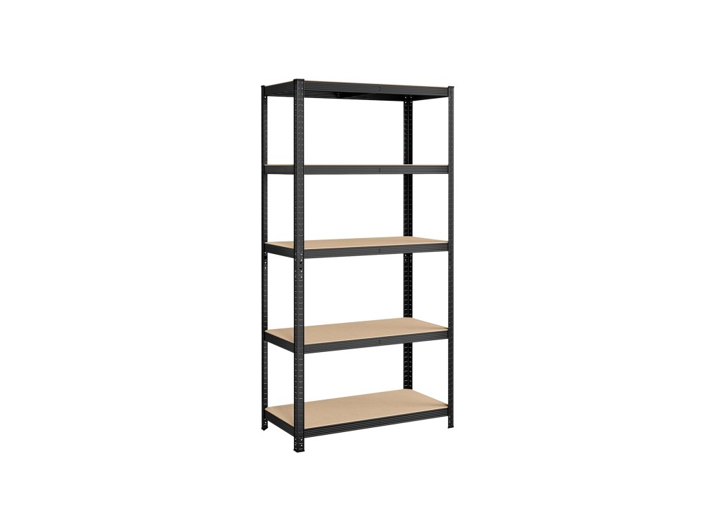 Pětipatrový regál, ocelový regál pro skladování, montáž bez nářadí, do garáže, přístřešku, nosnost 600 kg, 50 x 100 x 200 cm, černý.