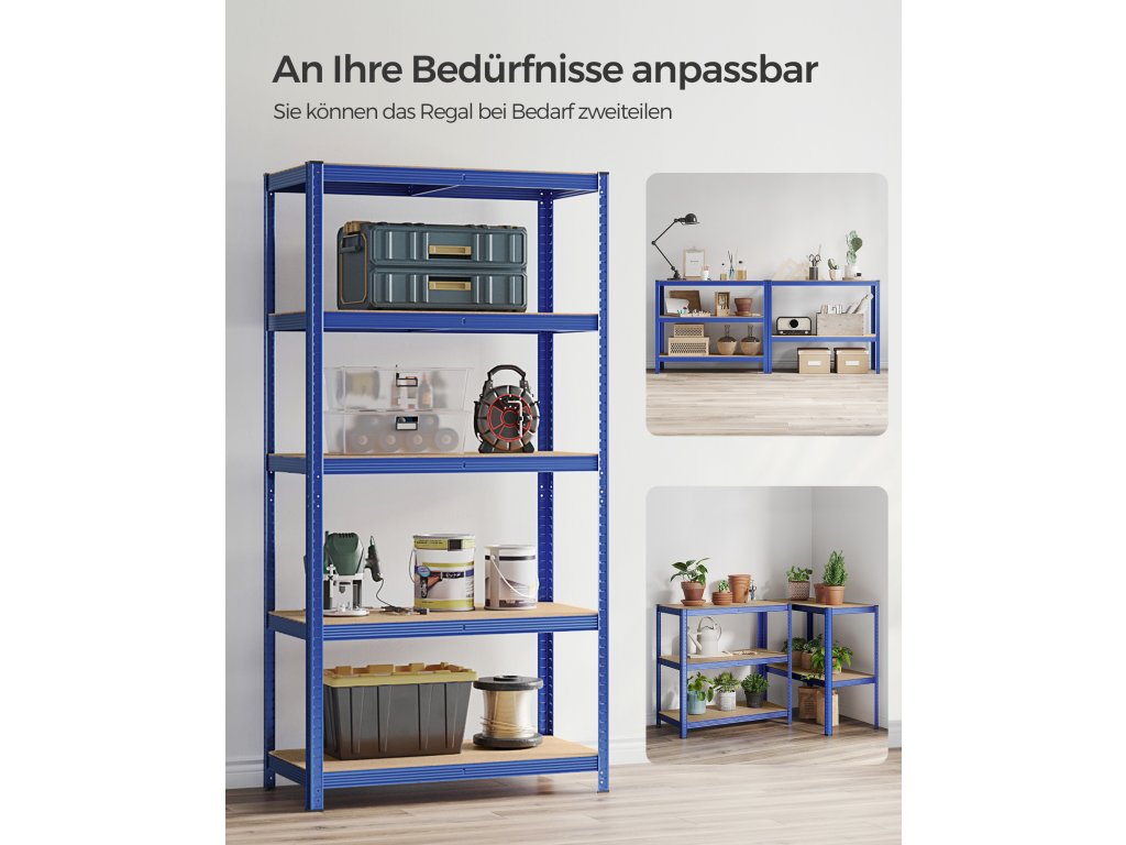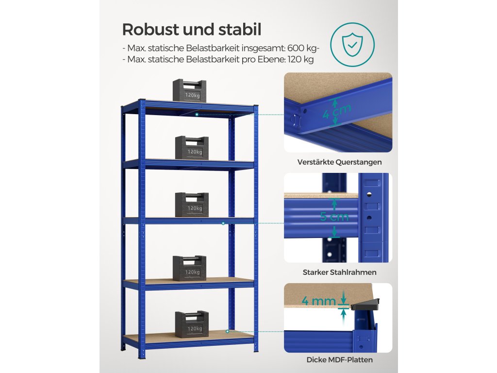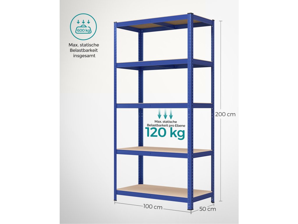 Pětipatrový regál, ocelový regál pro skladování, montáž bez nářadí, do garáže, přístřešku, nosnost 600 kg, 50 x 100 x 200 cm, modrý.