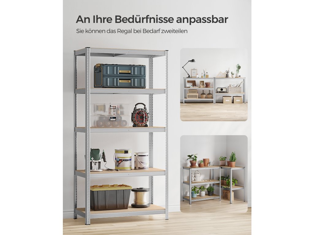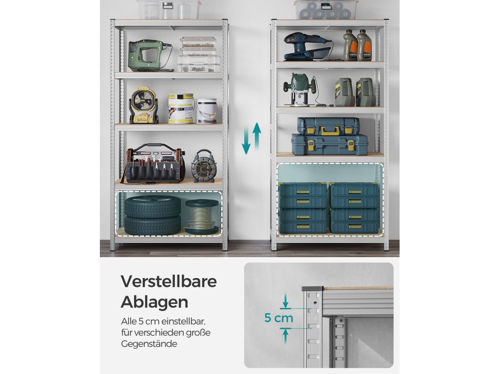 Heavy-Duty & Stable Tento garážový regál má ocelový rám a každá úroveň unese až 120 kg. Přiložená sada proti překlopení pomůže připevnit regálovou jednotku ke stěně, takže bude stabilnější a bezpečnější.Dělitelný Tento kovový regál lze rozdělit na 2 samostatné jednotky, aby vyhovoval vašim potřebám a prostoru; po rozdělení se skvěle hodí i jako pracovní stoly s úložným prostorem.Nastavitelné police Každou úroveň lze snadno nastavit každých 5 cm, což vyhovuje vašim potřebám ukládání předmětů různých velikostí.Velký rozměr, velká nosnost Tento regál o rozměrech 50 x 100 x 200 cm a celkové nosnosti 600 kg lze použít v garáži, skladu, sklepě. nebo technická místnost pro uspořádání veškerého nářadí a vybavení.Snadná montáž bez použití nářadí Tento odolný regál se snadno montuje a nevyžaduje žádné nářadí díky vzájemně propojené konstrukci a jasným pokynům.| Kategorie: | Regály a poličky |