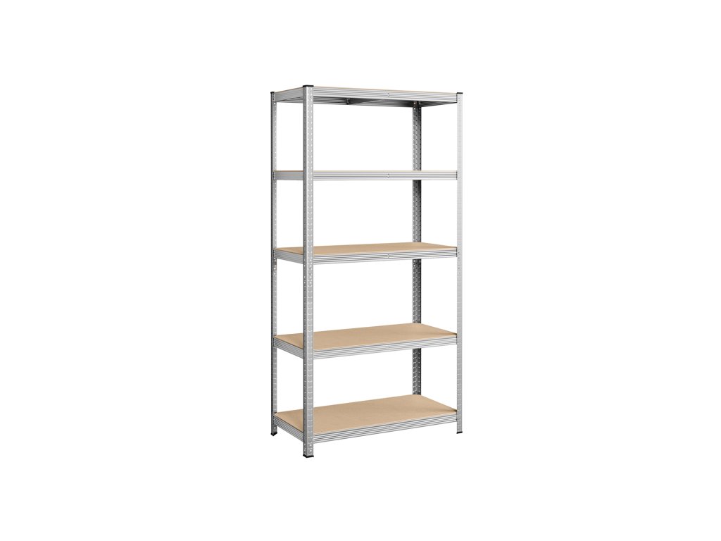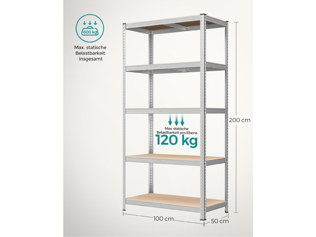 Pětipatrový regál, ocelový regál pro skladování, montáž bez nářadí, do garáže, kůlny, nosnost 600 kg, 50 x 100 x 200 cm, stříbrný.