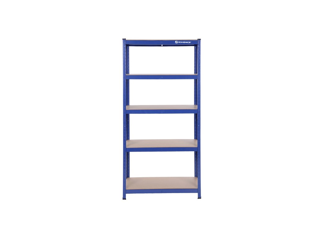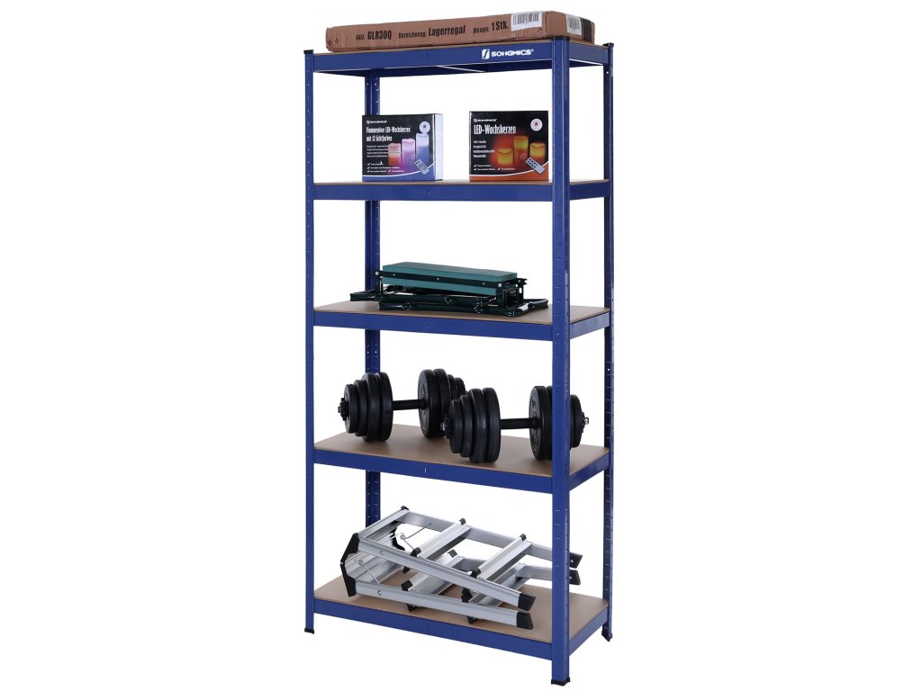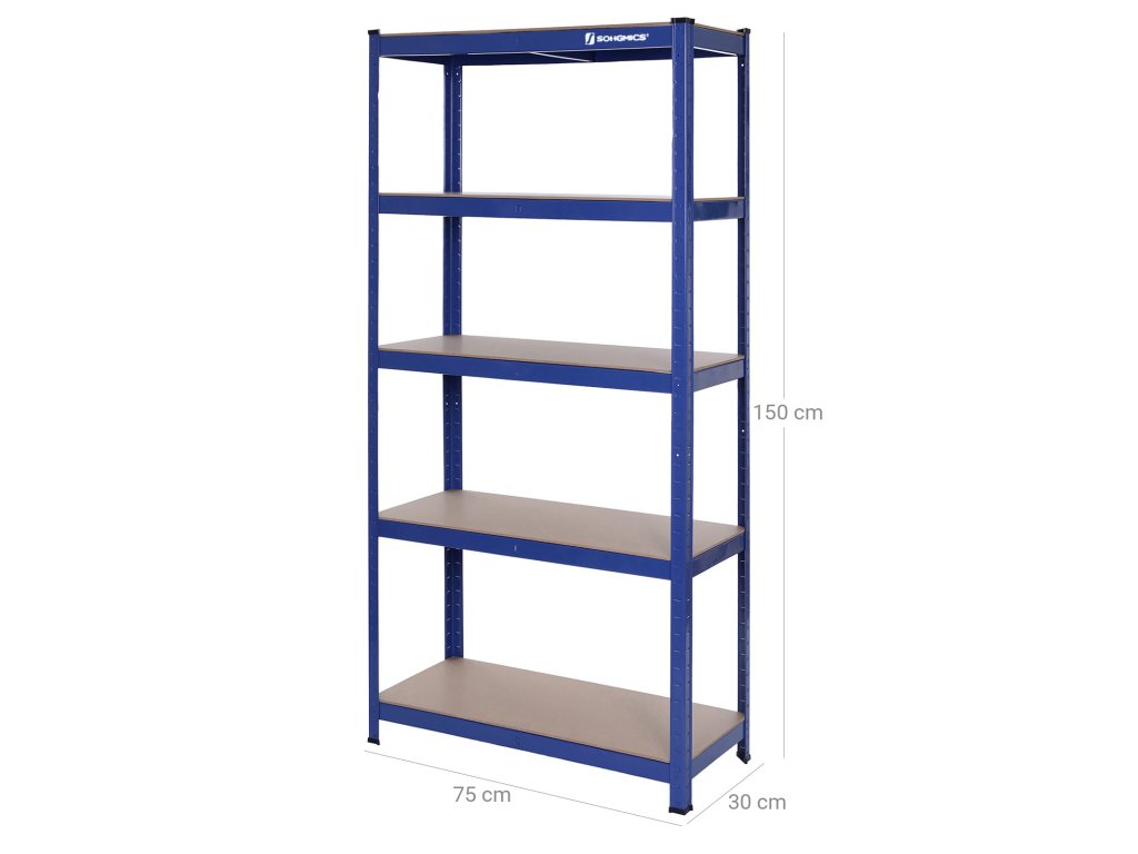 Pětipatrový regál, ocelový regál pro skladování, montáž bez nářadí, do garáže, přístřešku, nosnost 650 kg, 30 x 75 x 150 cm, modrý.