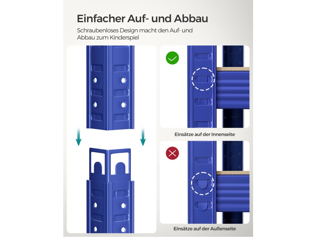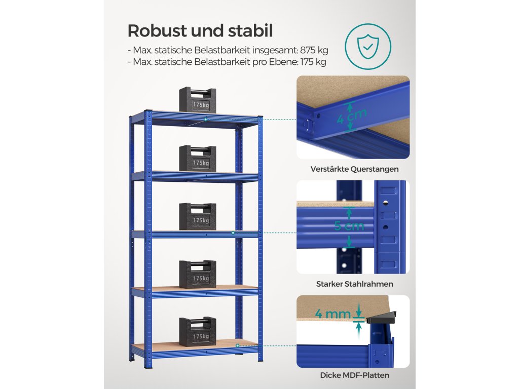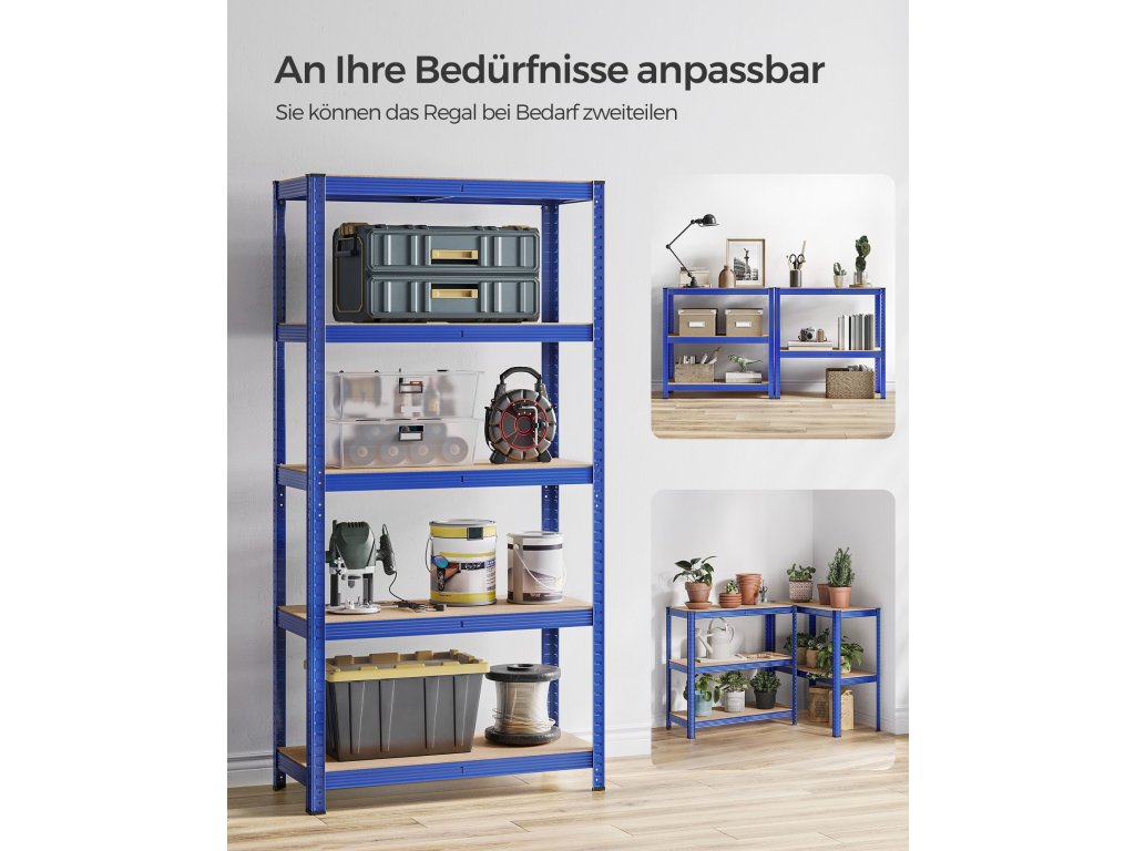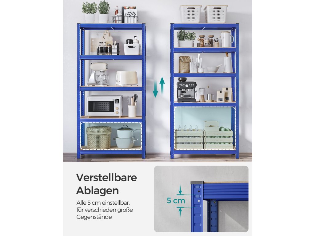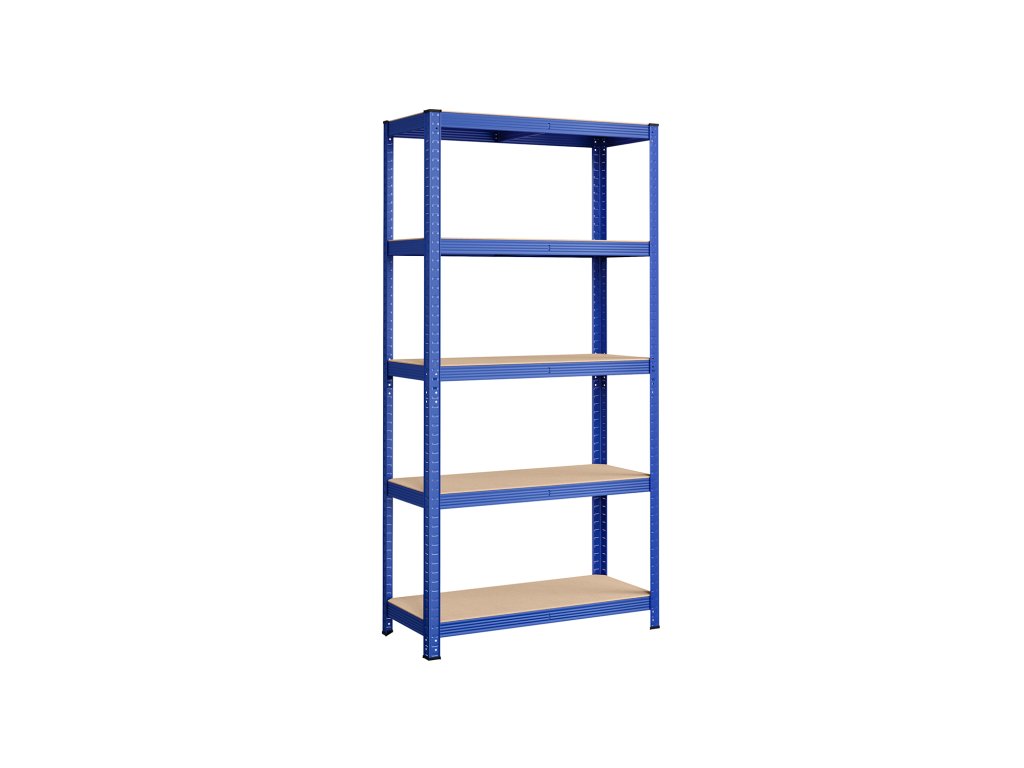 Pětipatrový regál, ocelový regál pro skladování, montáž bez nářadí, do garáže, přístřešku, nosnost 875 kg, 40 x 90 x 180 cm, modrý.