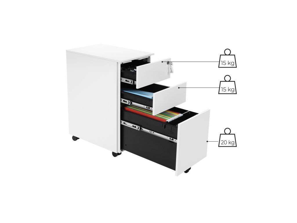 Pojízdná kartotéka, kancelářská skříň s kolečky a zámkem, pro dokumenty formátu A4, Legal, Letter, závěsné pořadače, bílá.
