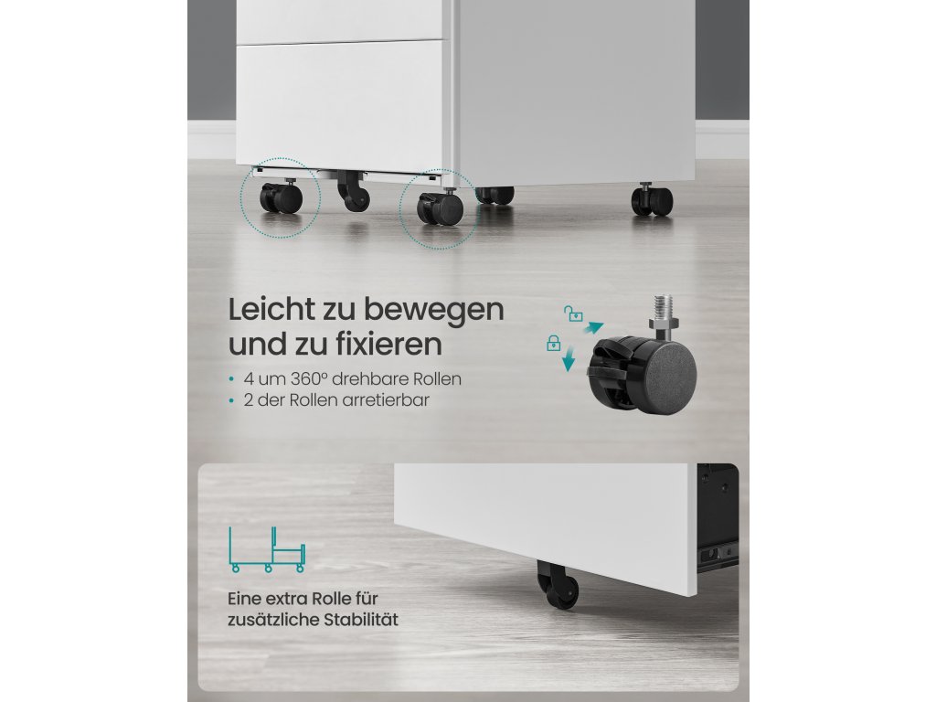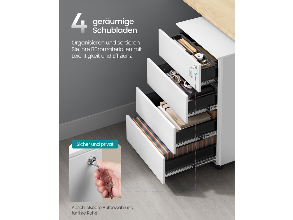 Vše na jednom místě Pokud máte doma nebo v kanceláři na stole nepořádek, který se zdá být neřešitelný, tato kancelářská skříň se 4 zásuvkami vám pomůže zjednodušit pracovní den; na dosah ruky je také zásobník na samolepicí bločky a kancelářské sponky;Síla a kapacita Jste pracovitý? Tato kartotéka s ocelovou konstrukcí a nosností 15 kg pro každou zásuvku je dostatečně pevná, aby pojmula všechny vaše dokumenty a psací potřeby.Kompletní otevírání a zavírání Odolné výsuvy s plným výsuvem umožňují úplné vysunutí zásuvek a jejich podepření bez naklápění; pokročilý zámek vše chrání před zvědavýma rukama.Již smontované Tato skříňka zásuvkové jednotky se dodává smontovaná, takže nemusíte trávit čas složitou montáží; stačí se rozhodnout, zda instalovat 5 kol (2 s brzdami);Co získáte Kartotéka se 4 zásuvkami, zámkem pro bezpečné uložení vašich tajemství, 4 kolečky pro usnadnění pohybu a dalším kolečkem pro větší stabilitu; poskytněte své kanceláři více úložného prostoru!;| Kategorie: | Kancelářské skříně |