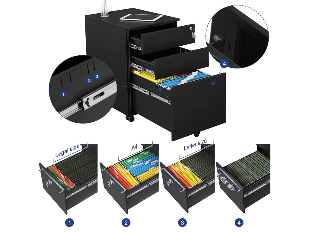 Více místa v kanceláři: S touto flexibilní a uzamykatelnou pojízdnou kartotékou budete mít ve své kanceláři nebo domácí pracovně konečně pořádek - ušetříte místo pod stolem.Flexibilní úložiště: Ocelový podstavec má 3 plně otevřené zásuvky, spodní zásuvka je vhodná pro závěsné pořadače formátu A4, s přiloženými 2 závěsnými lištami se hodí také pro pořadače F4. Závěsné pořadače formátu Letter a LegalRobustní skříň: Kancelářský podstavec je vyroben z oceli a nabízí ideální stabilitu při vysokém zatížení.Uzamykatelná skříňka s kolečky: Díky kompaktním rozměrům se skříňka vejde i pod pracovní stoly.Co získáte: 1 x kartotéka (korpus skříně je předem smontován), 1 x taška na příslušenství, 1 x ilustrovaný návod, profesionální zákaznický servis a záruka spokojenosti.| Kategorie: | Kancelářské skříně |