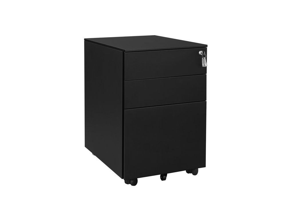 Pojízdná kartotéka se 3 zásuvkami, uzamykatelný ocelový podstavec se závěsnými lištami pro zavěšení pořadačů, kompletně sestavený kromě koleček, černá.